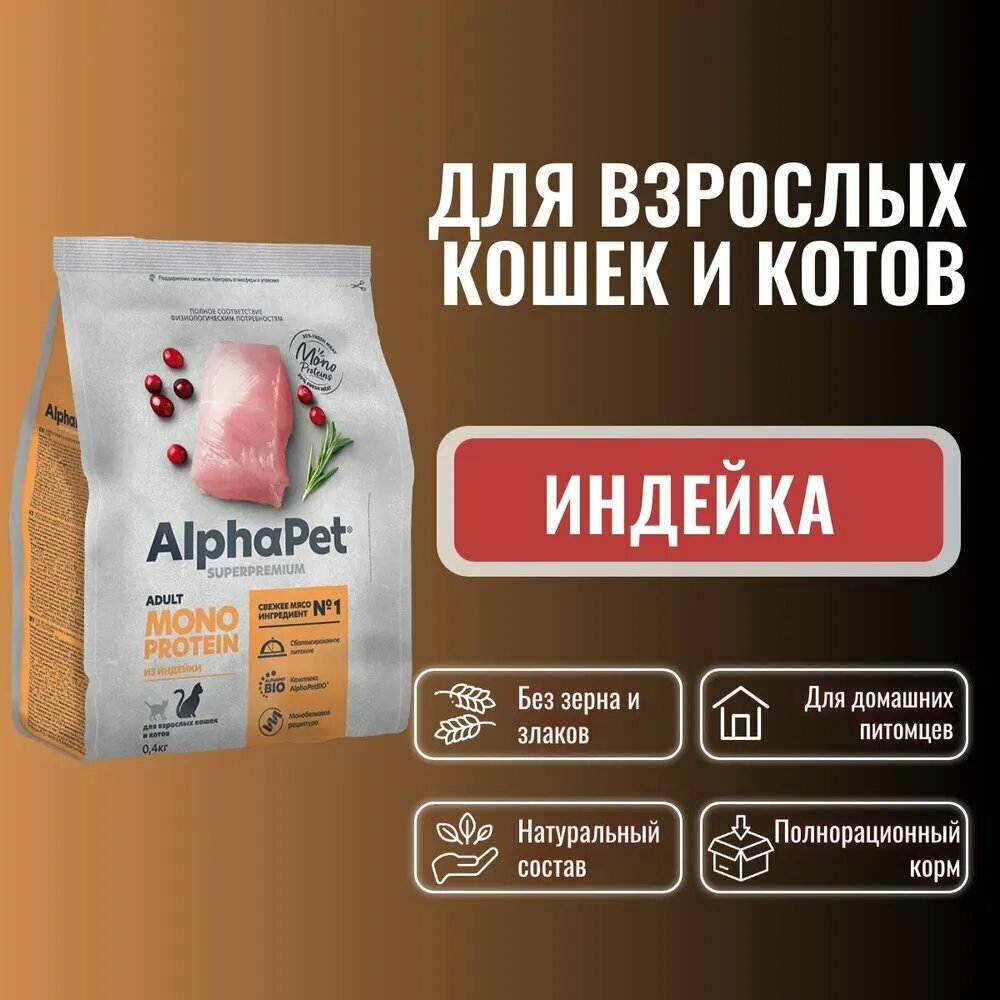Сухой корм из индейки для взрослых кошек AlphaPet Superpremium MONOPROTEIN 0,4 кг