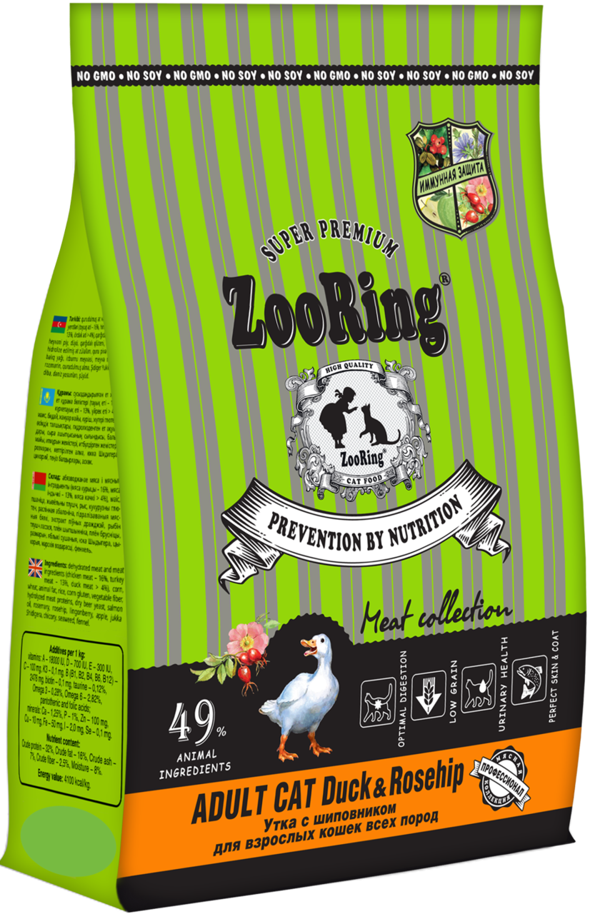 Сухой корм ZooRing ADULT CAT утка с шиповником для кошек, 1,5кг
