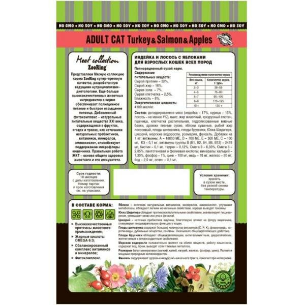 ZOORING ADULT CAT TURКEY & SALMON & APPLES для взрослых кошек с индейкой, лососем и яблоком NEW 1,5 кг