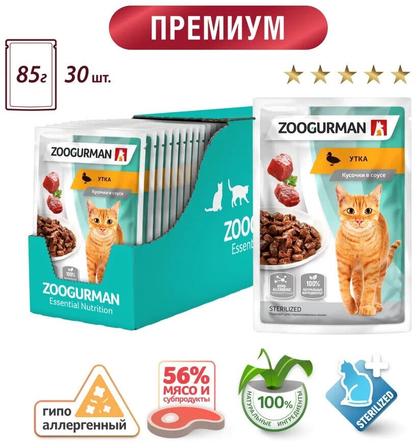 СохранитьЗоогурман влажный корм для кошек кусочки в соусе Утка 85г (30 штук) интересное: