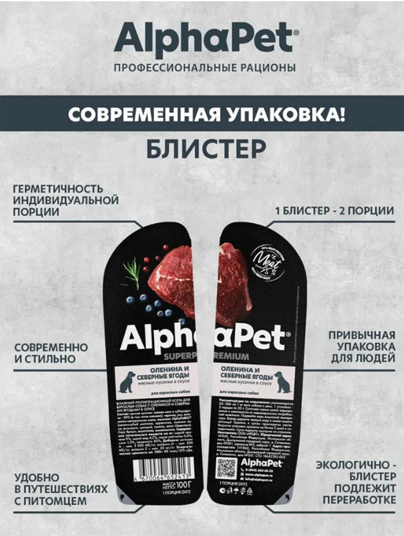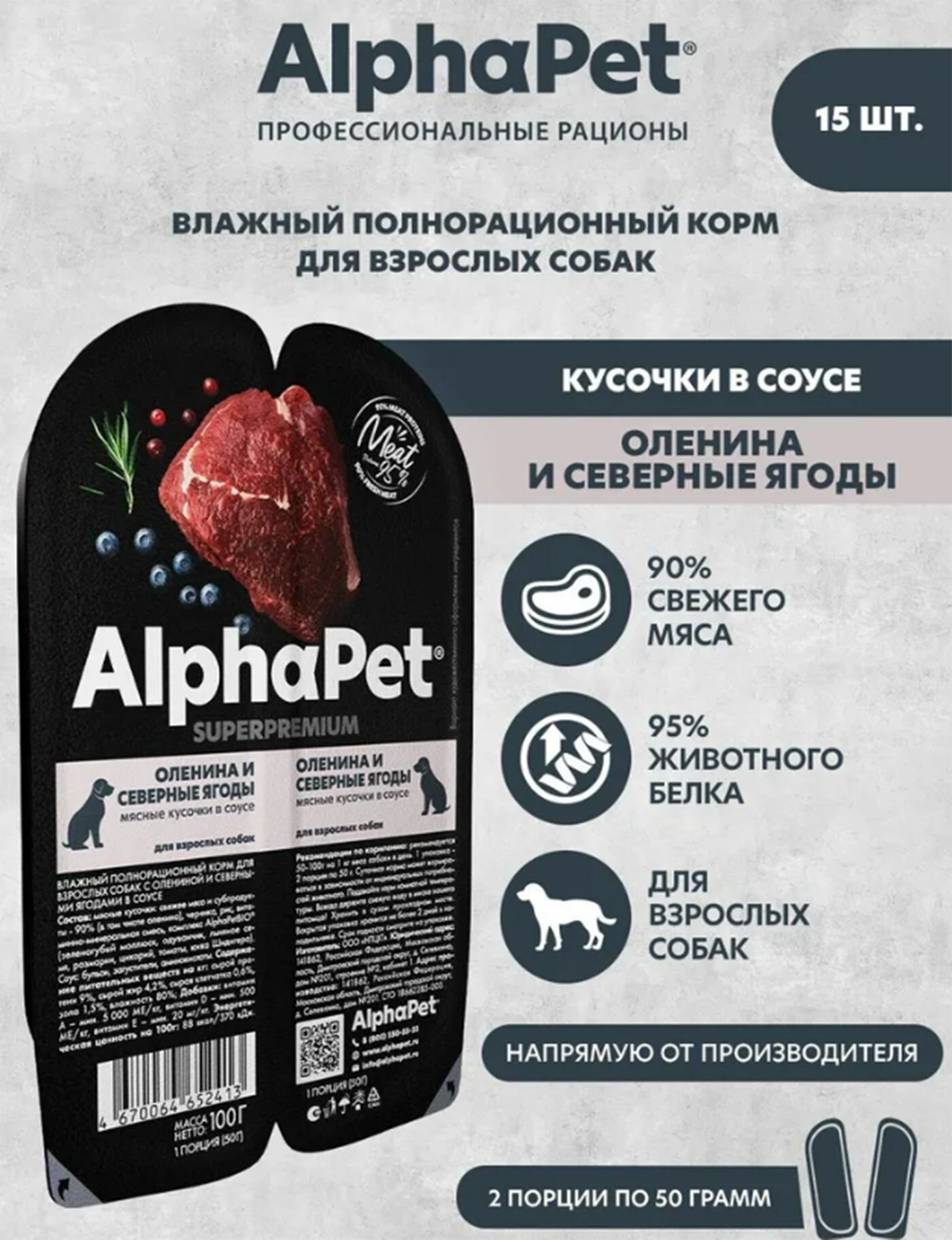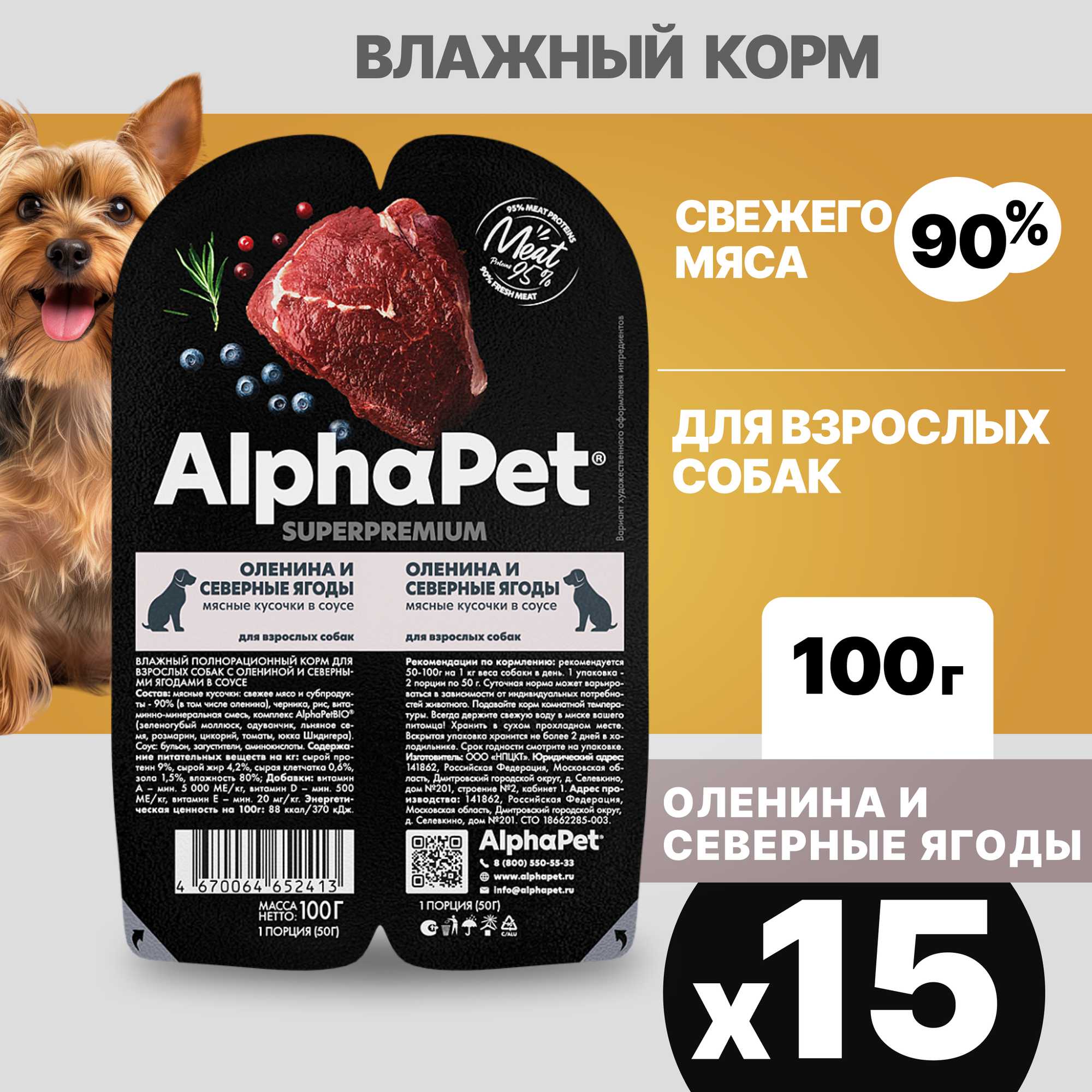 Купить Влажный корм для собак AlphaPet Superpremium оленина и северные ягоды,упаковка 15 шт х 100 гр
