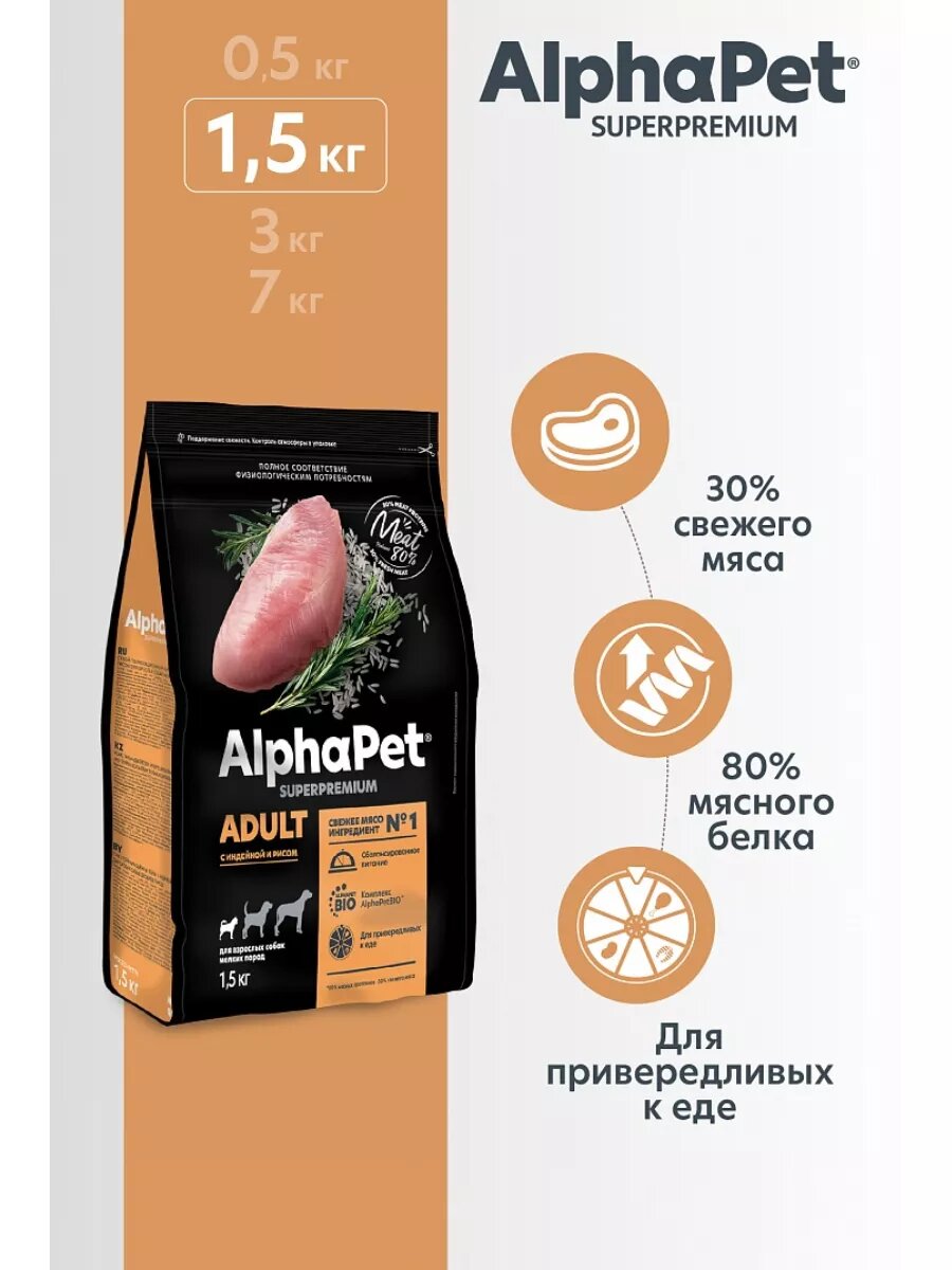 AlphaPet Superpremium сухой для собак мелких пород, с индейкой и рисом 2уп по 1,5кг