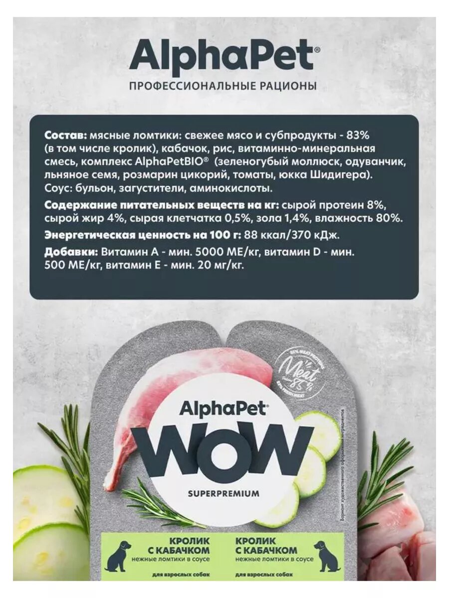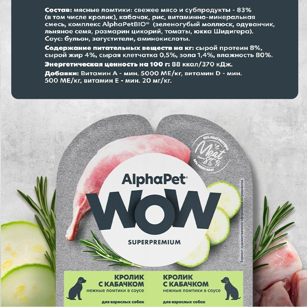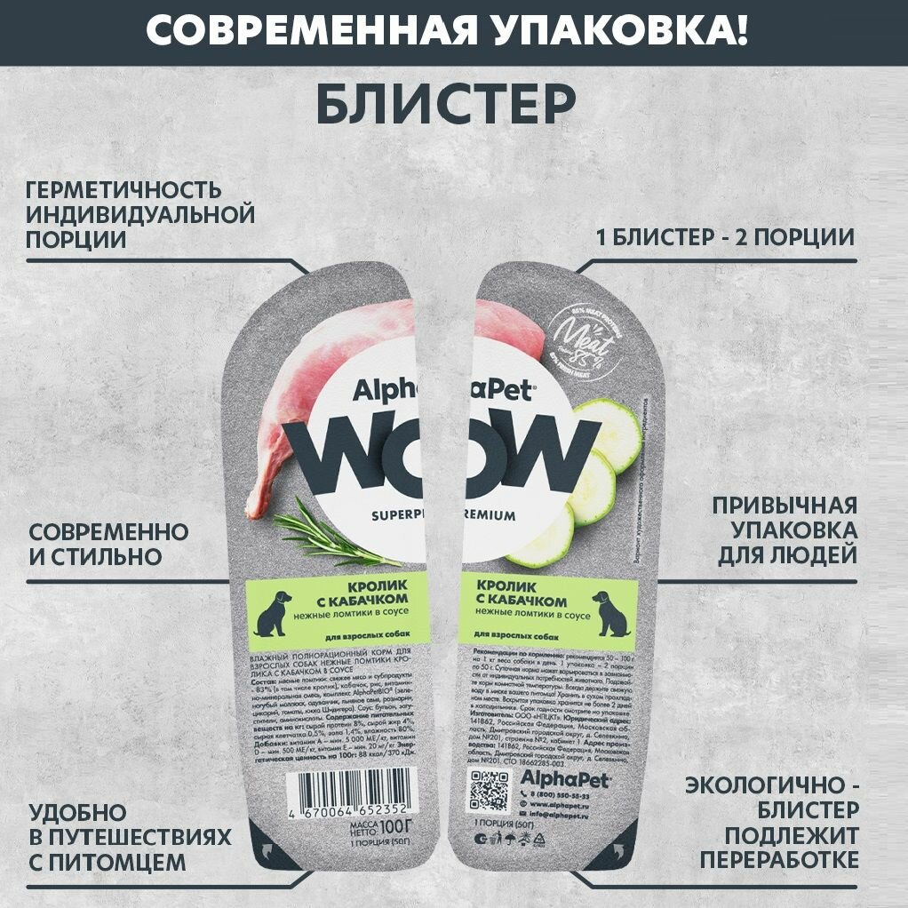 ALPHAPET WOW SUPERPREMIUM 100 гр ламистер влажный корм для взрослых собак кролик с кабачком 45 шт