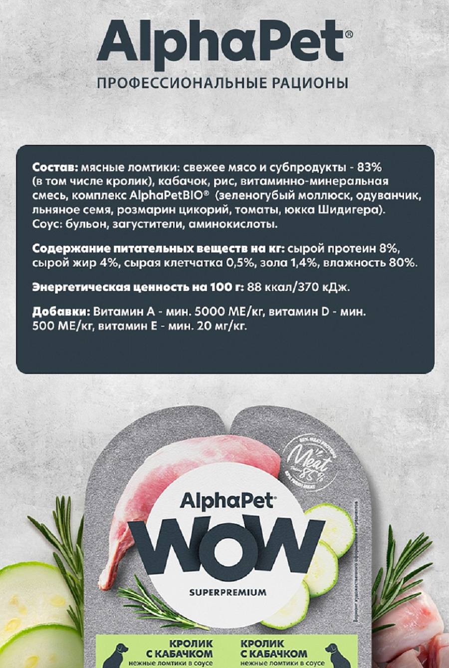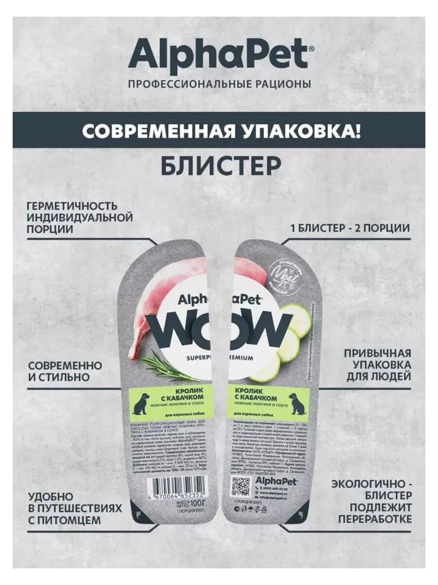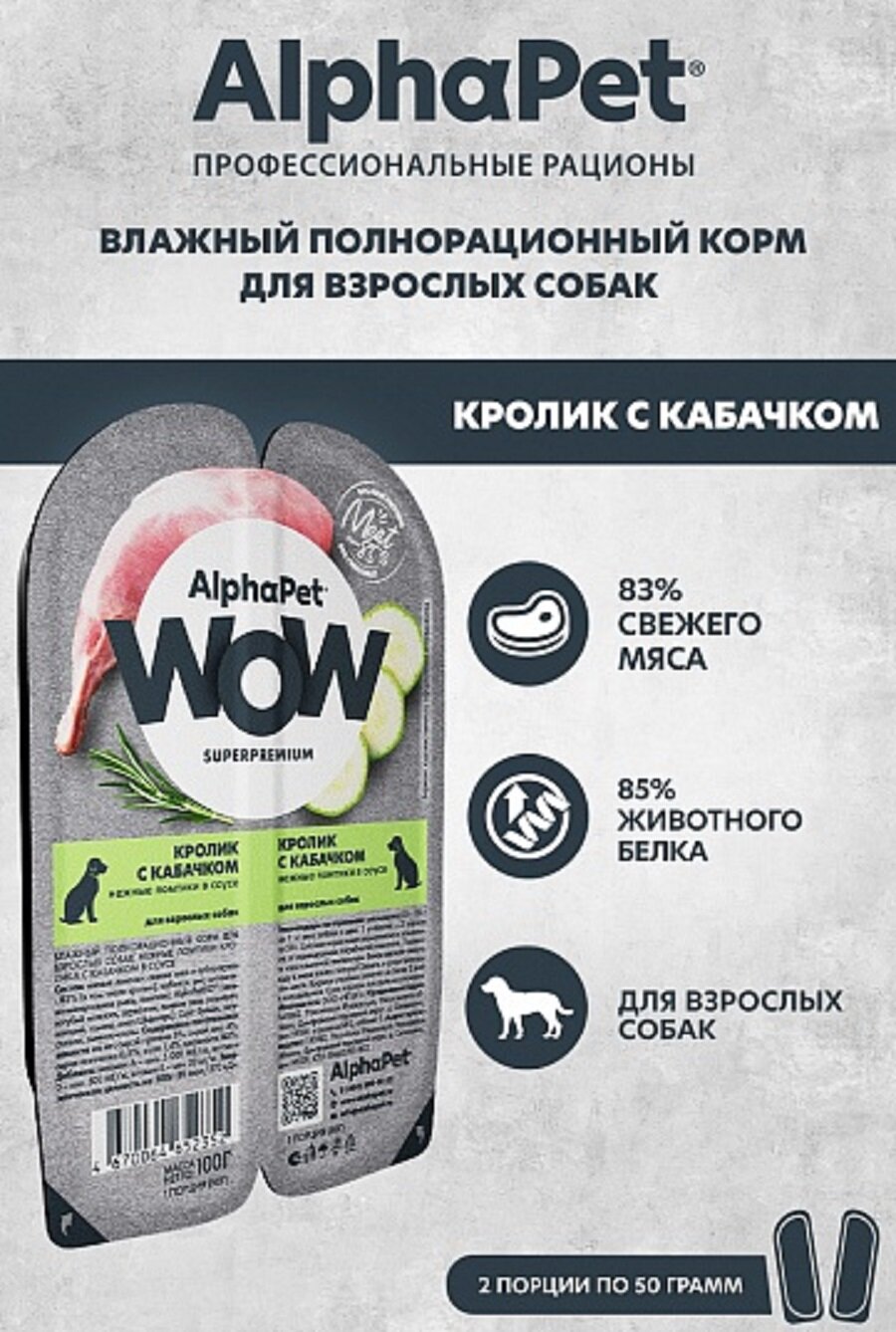 ALPHAPET WOW SUPERPREMIUM 100 гр ламистер влажный корм для взрослых собак кролик с кабачком 45 шт