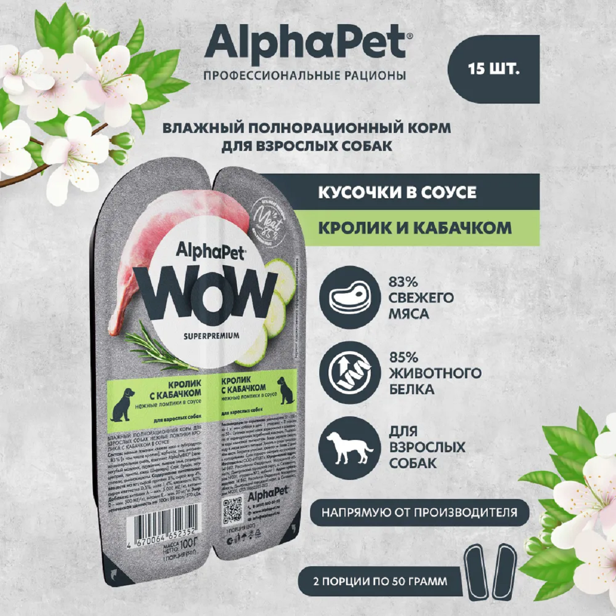 Влажный полнорационный корм для взрослых собак AlphaPet WOW Superpremium, Кролик с кабачком нежные ломтики в соусе, 100г * 15 шт