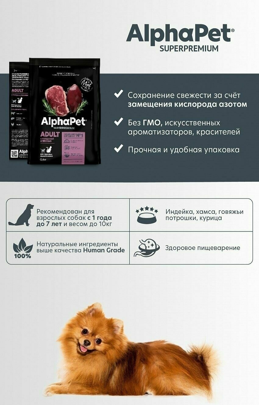 Сухой корм AlphaPet Superpremium с индейкой и рисом для взрослых собак мелких пород, 1,5 кг
