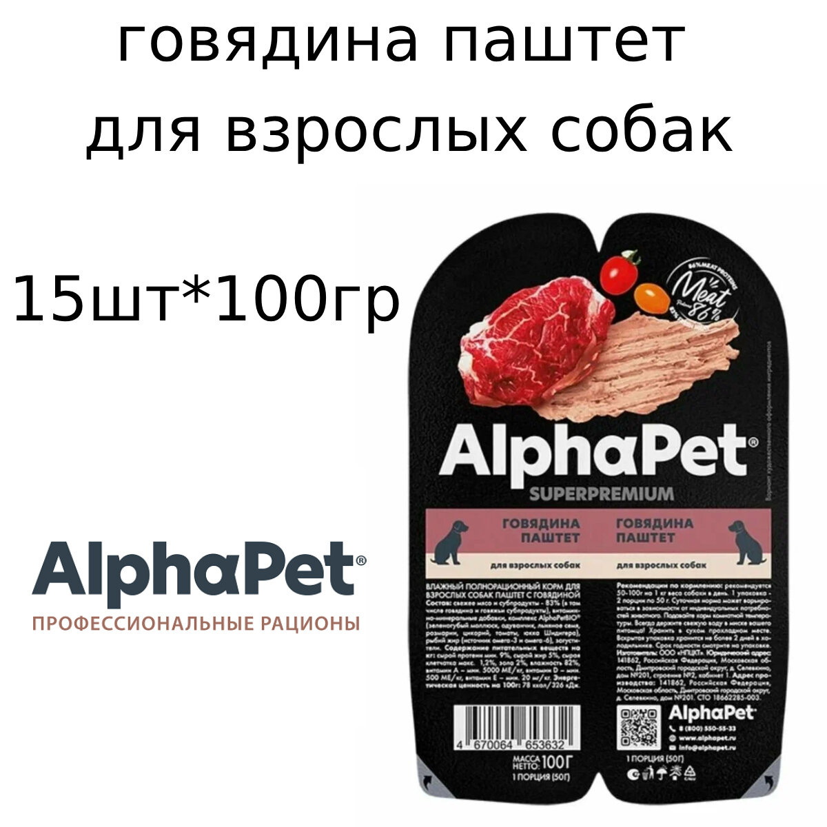 Влажный полнорационный корм для взрослых собак AlphaPet Superpremium, паштет с говядиной, 100г *15шт