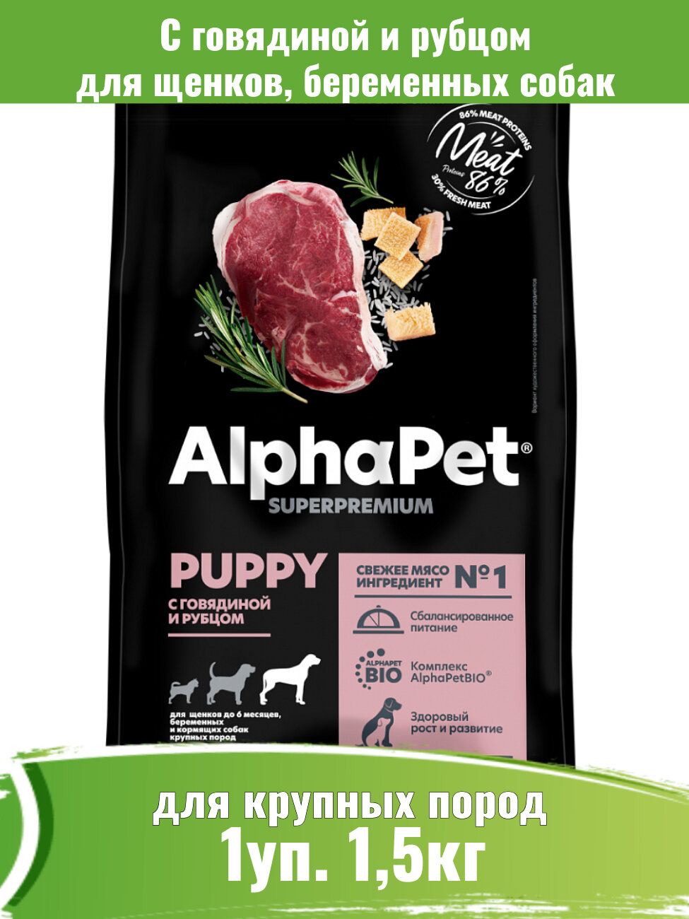 Корм AlphaPet Superpremium сухой для щенков до 6 мес, беременных и кормящих собак крупных пород, говядина и рубец 1,5 кг