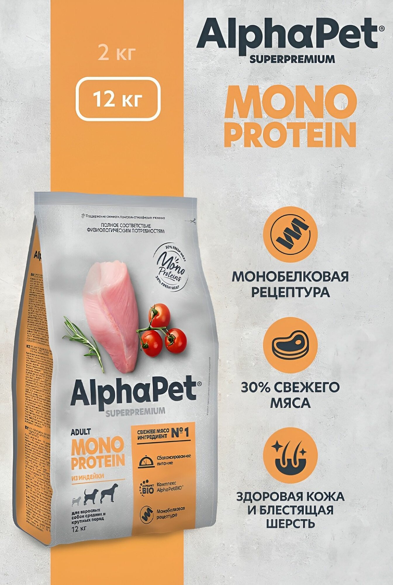 AlphaPet Superpremium Сухой корм монобелковый для взрослых собак средних и крупных пород, Индейка 12кг