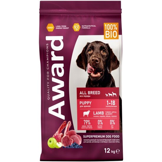 Купить Корм сухой Award для щенков от 1 месяца, беременных и кормящих сук всех пород с ягненком и индейкой с добавлением яблока и черники 12кг