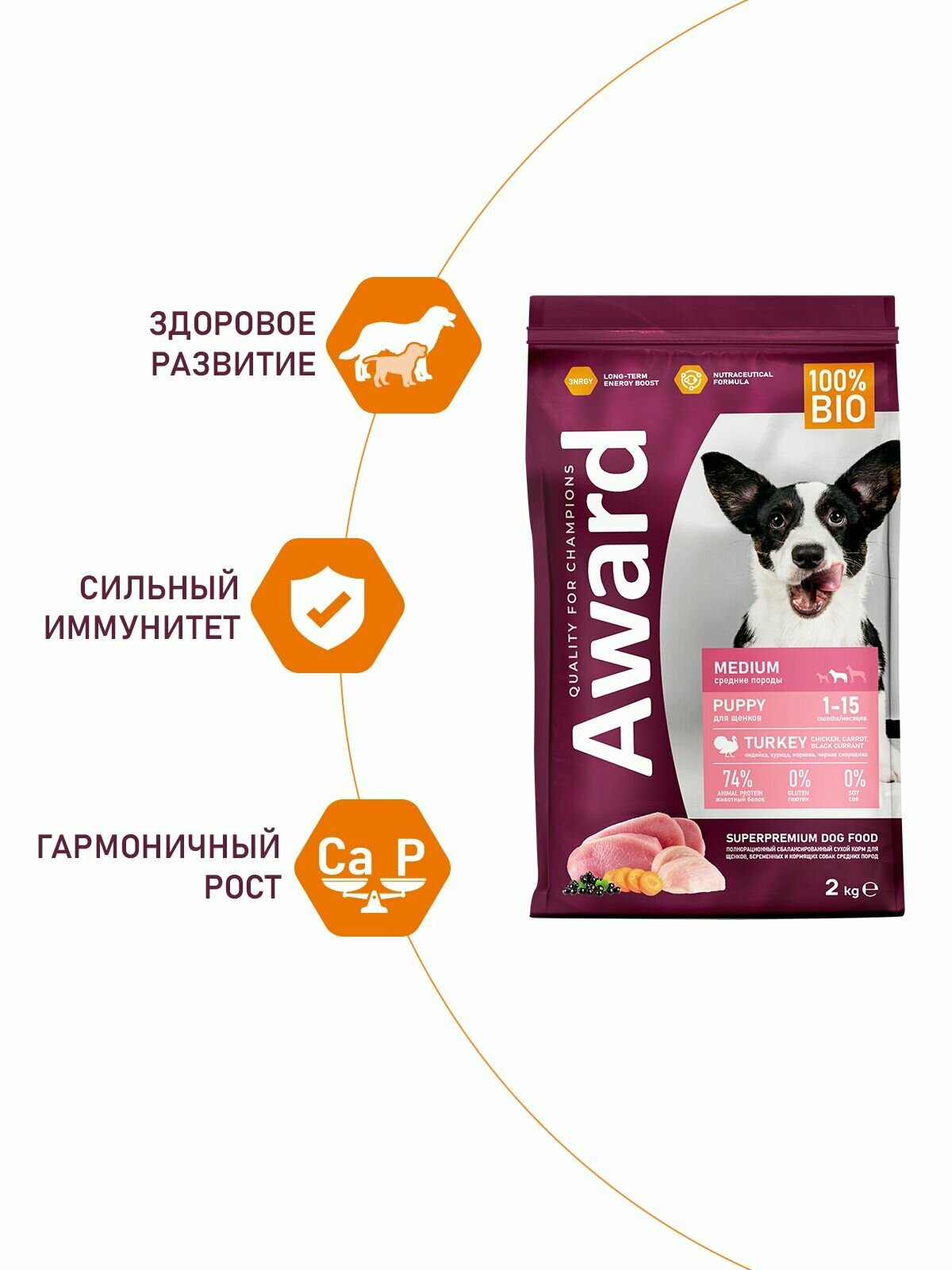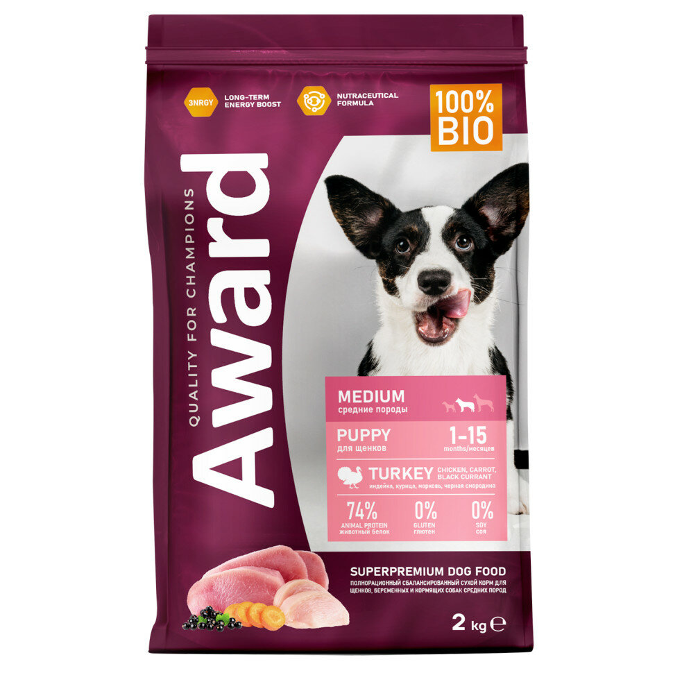 Купить AWARD сухой корм для щенков средних пород от 1 месяца, беременных и кормящих сук, с индейкой, курицей, морковью и черной смородиной - 2 кг
