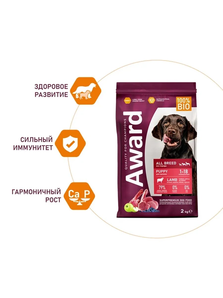 Сухой корм 2 кг с индейкой и ягненком AWARD для щенков от 1 месяца, беременных и кормящих сук всех пород, 1 упаковка
