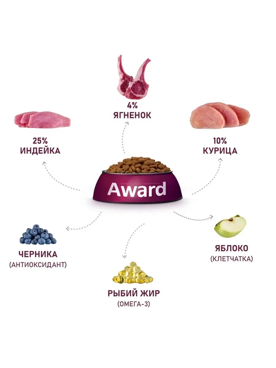 Award - Сухой корм для щенков от 1 месяца, беременных и кормящих сук всех пород с ягненком и индейкой с добавлением яблока и черники (2кг)