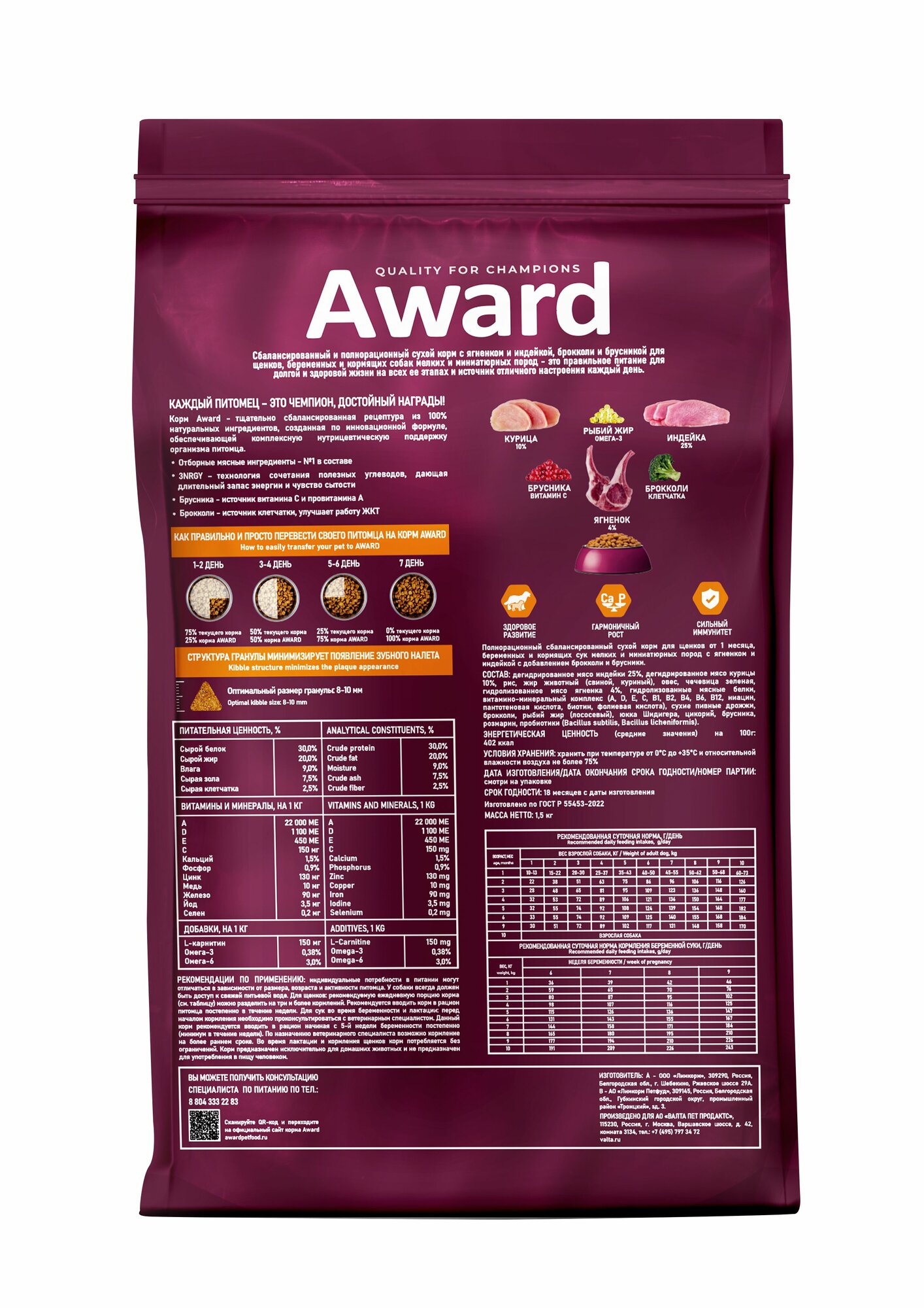 Купить Сухой корм AWARD для щенков от 1 мес, беременных и кормящих сук мелких и мин. пород с ягненком и индейкой с добавлением брокколи и брусники 1,5кг (7173402)
