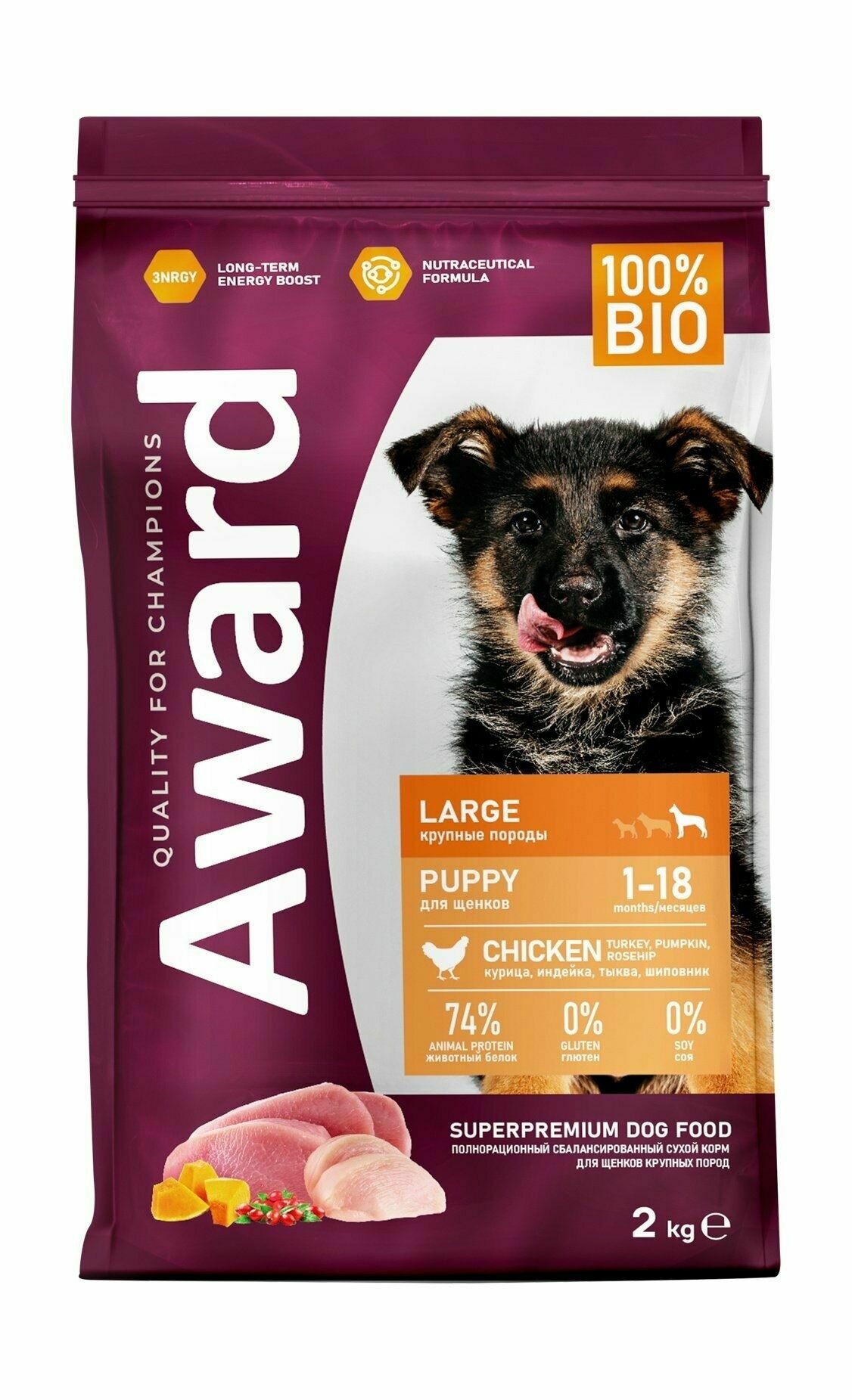 Сухой корм AWARD для щенков крупных пород с курицей, индейкой, тыквой и шиповником 2кг