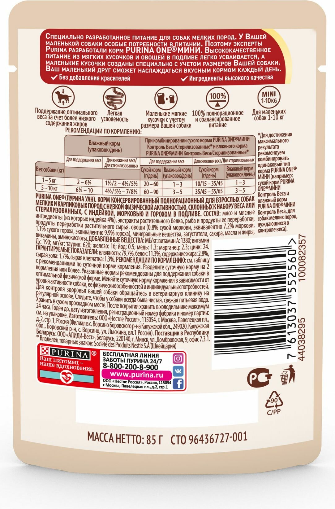 СохранитьPurina ONE Мини 85 г пауч влажный корм контроль веса для собак для собак с индейкой, морковью и горохом в подливе х26 штук интересное: