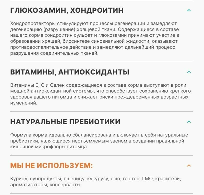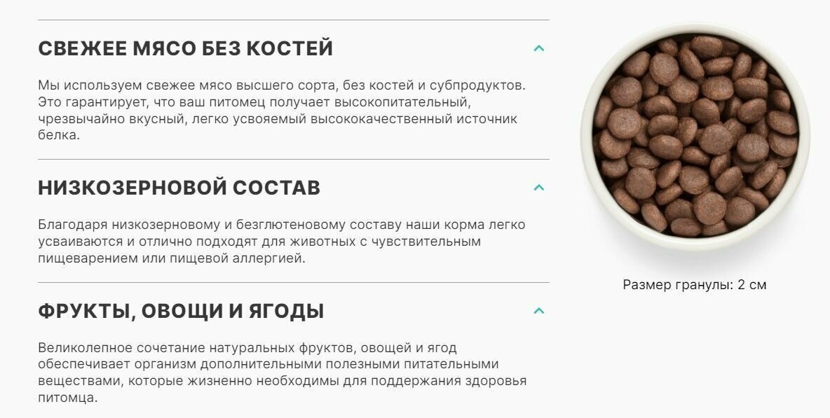 | Особые потребности | беззерновой / гипоаллергенный / для активных животных / для здоровья кожи и блеска шерсти / для здоровья костей и суставов / для снижения запаха стула / для ухода за ротовой полостью / при чувствительном пищеварении |