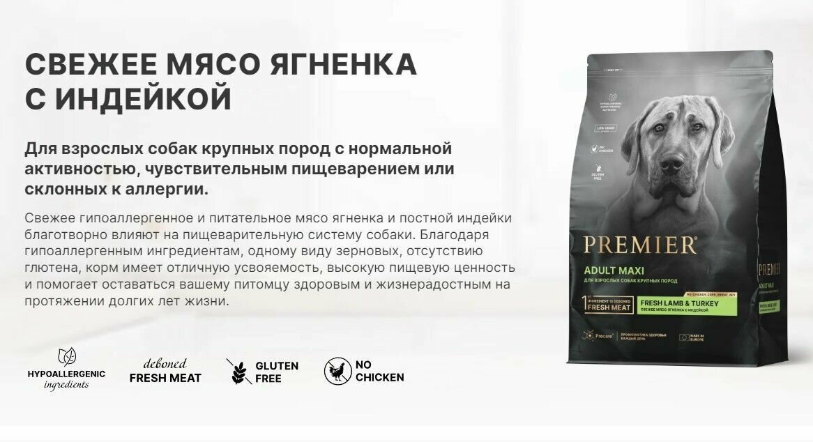 Сухой корм Premier Dog Lamb&Turkey ADULT Maxi Свежее мясо ягненка с индейкой для собак крупных пород, 3 кг