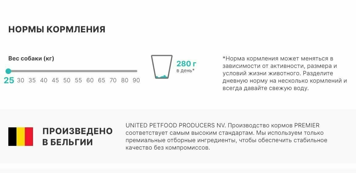 | Дозировка | Норма кормления может меняться в зависимости от активности, размера и условий жизни животного. Разделите дневную норму на несколько кормлений и всегда давайте свежую воду. |