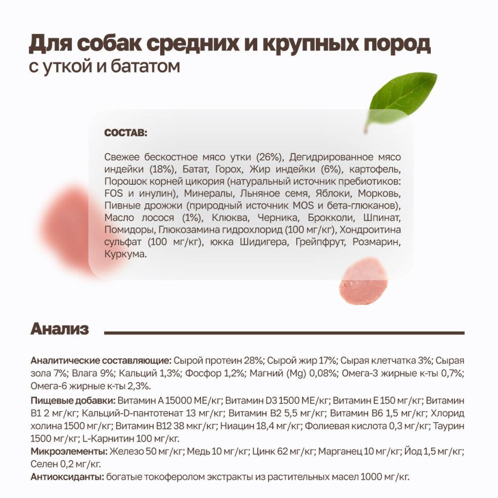 Беззерновой корм с живыми пробиотиками: свежее мясо утки с бататом для собак средних и крупных пород, 10кг.