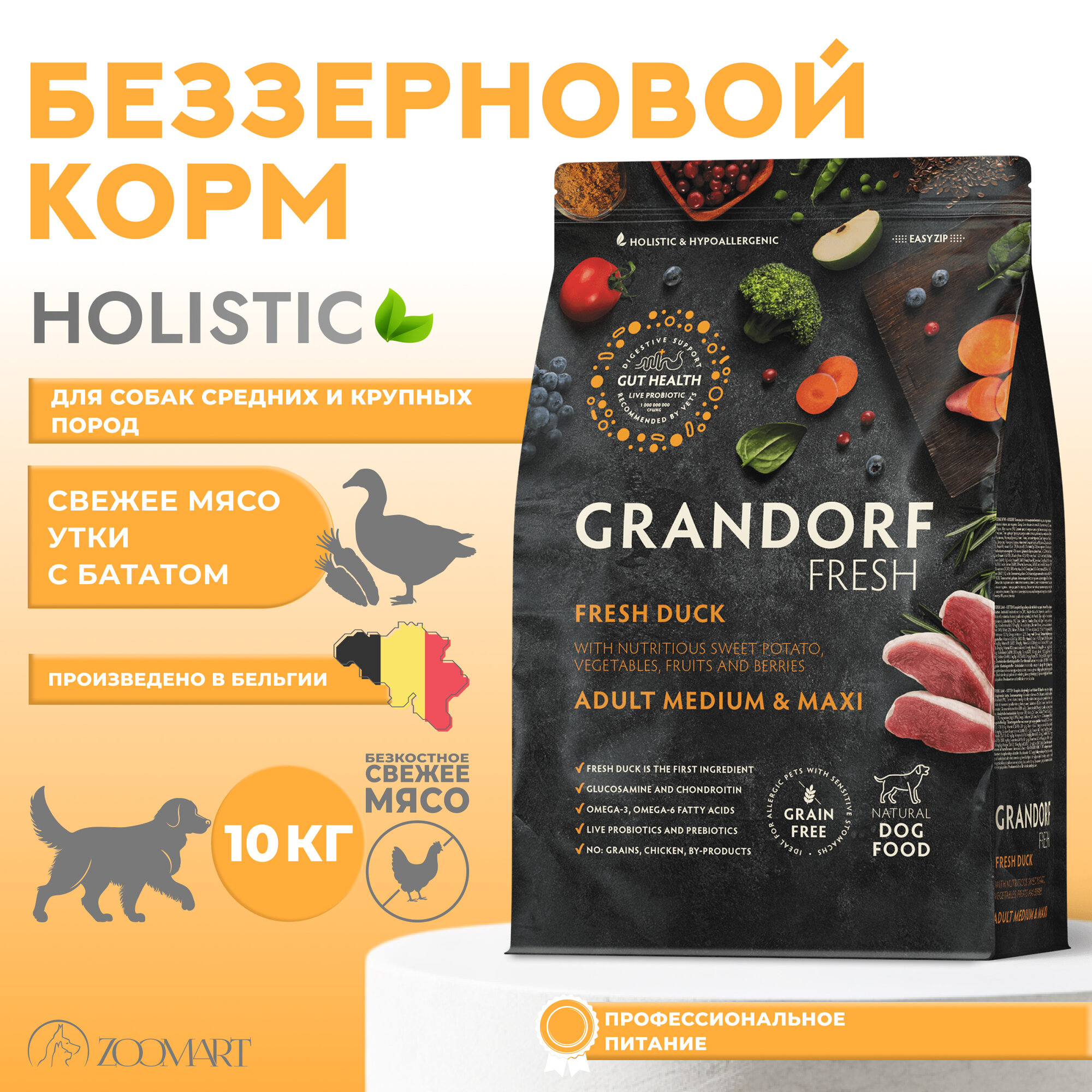 Корм сухой Grandorf Fresh , беззерновой с живыми пробиотиками, свежее мясо утки с бататом для собак средних и крупных пород, 10 кг