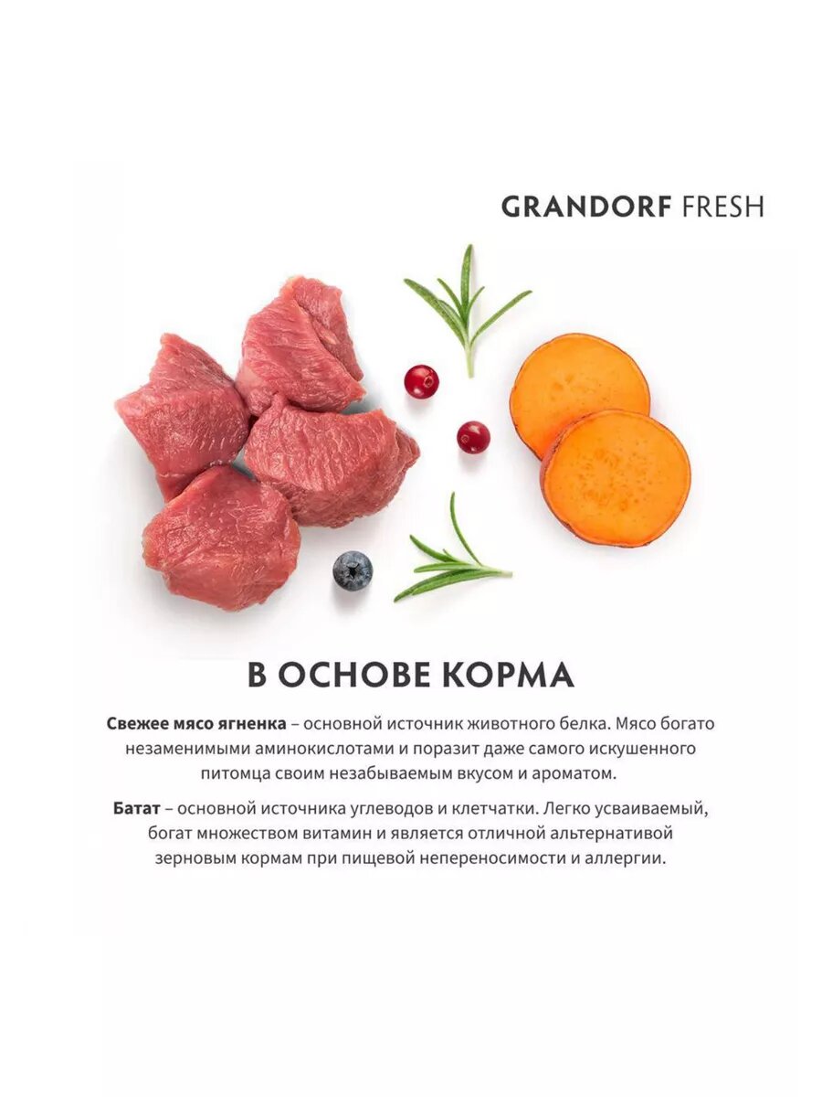 Сухой беззерновой корм Grandorf FRESH свежее мясо ягненка с бататом для юниоров, с живыми пробиотиками. Для средних и крупных пород с 4 месяцев, беременных и кормящих собак 1 кг