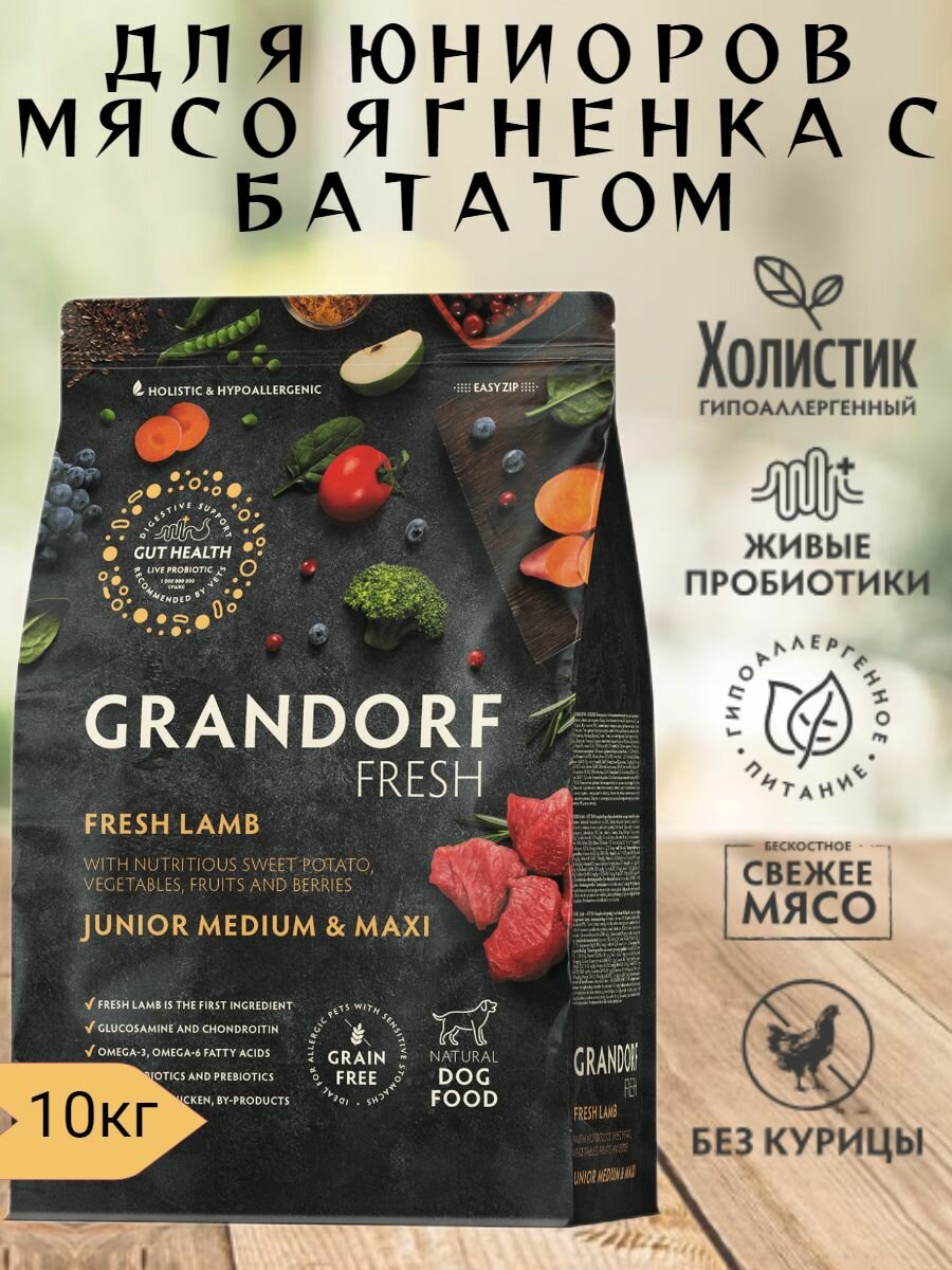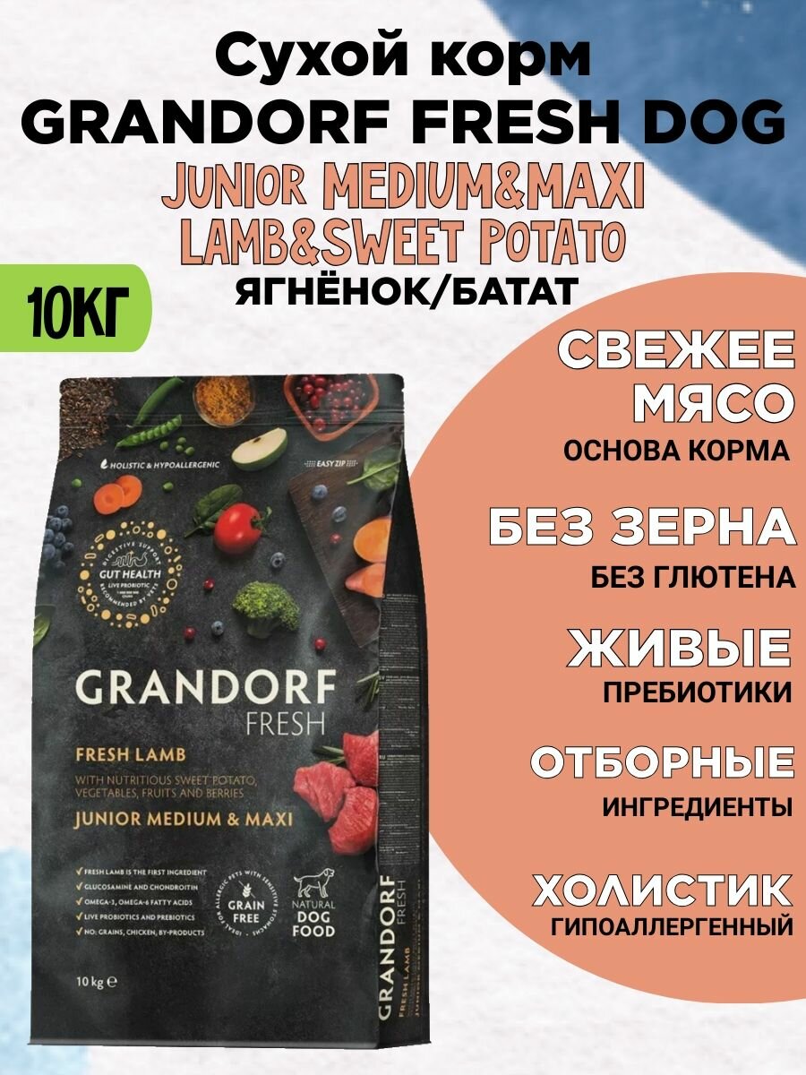Купить Корм сухой Grandorf Fresh , беззерновой с живыми пробиотиками, свежее мясо ягненка с бататом для юниоров средних и крупных пород, 10 кг
