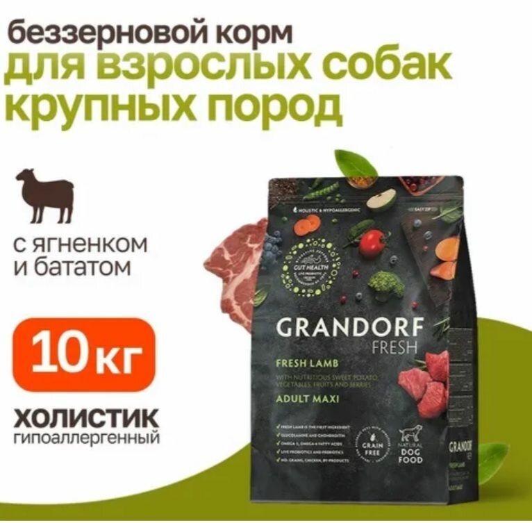 Сухой беззерновой корм Grandorf Fresh свежее мясо ягненка с бататом для взрослых собак средних и крупных пород, с живыми пробиотиками, с чувствительным пищеварением или склонных к аллергии, 10 кг