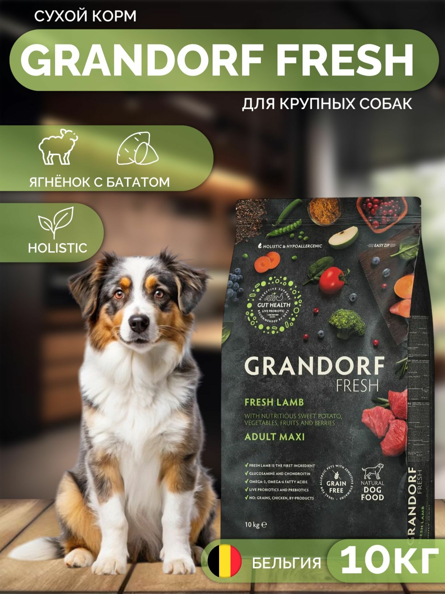 Сухой беззерновой корм Grandorf Fresh свежее мясо ягненка с бататом для взрослых собак крупных пород с живыми пробиотиками. Для собак с чувствительным пищеварением или склонных к аллергии, 10 кг