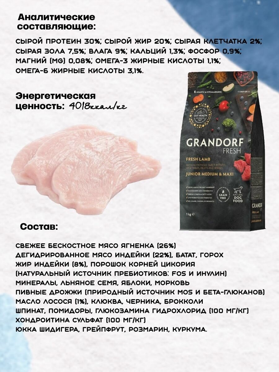 Сухой беззерновой корм Grandorf FRESH свежее мясо ягненка с бататом для юниоров, с живыми пробиотиками. Для средних и крупных пород с 4 месяцев, беременных и кормящих собак 1 кг