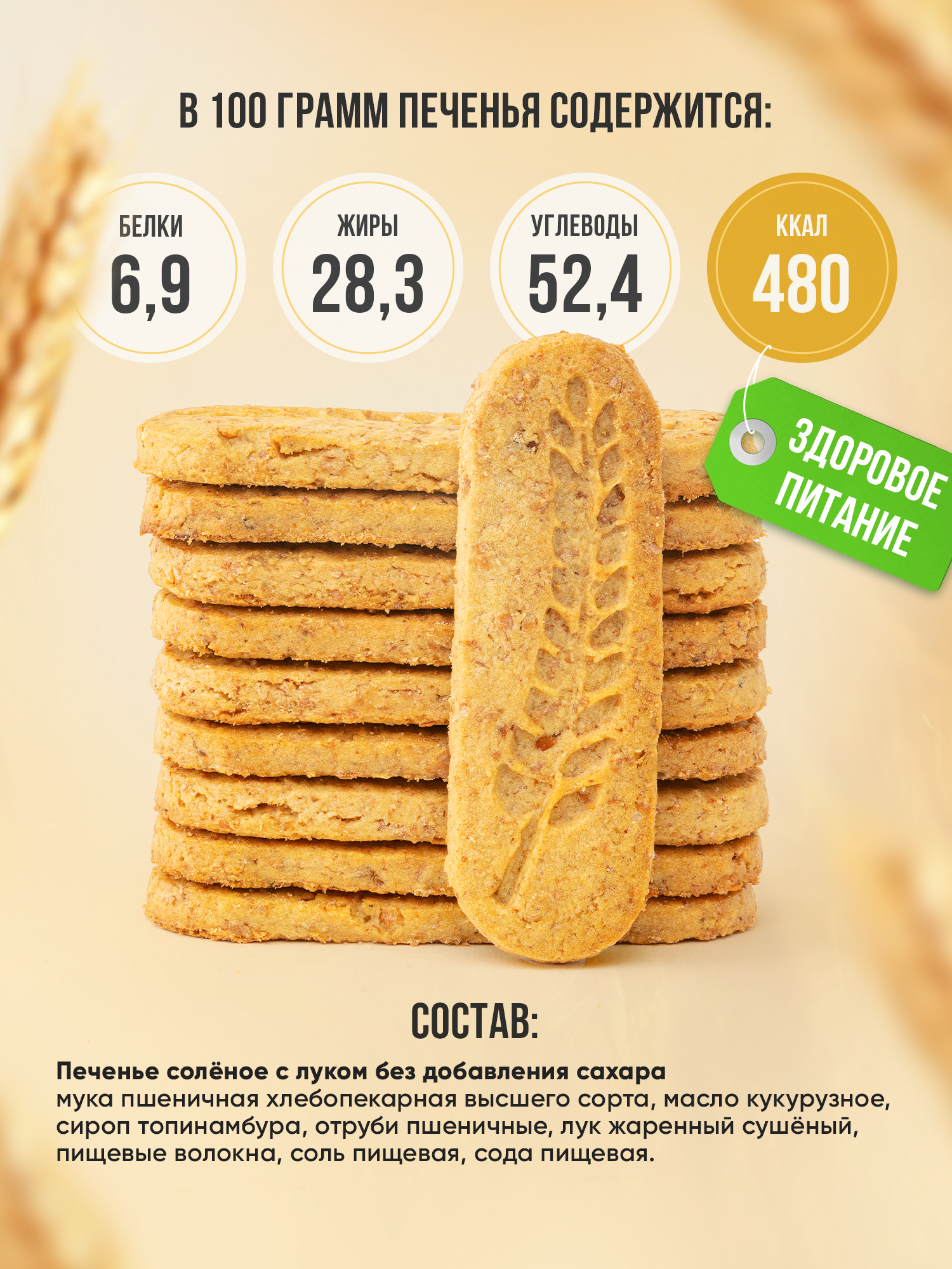 | Состав | мука пшеничная хлебопекарная высшего сорта, масло кукурузное рафинированное дезодорированное, сироп топинамбура, отруби пшеничные, пищевые волокна, соль пищевая, сода пищевая. |
