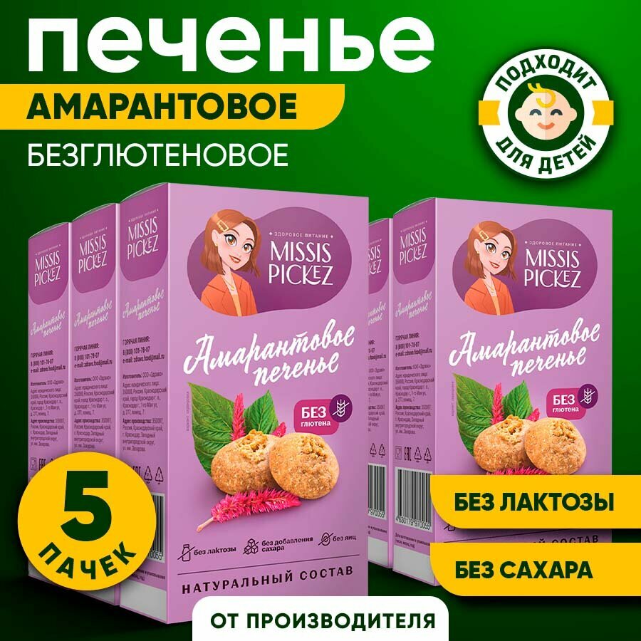 Купить Missis Pickez Печенье Амарантовое без добавления сахара и глютена, без лактозы Натуральное для детского питания Набор - 5 упаковок