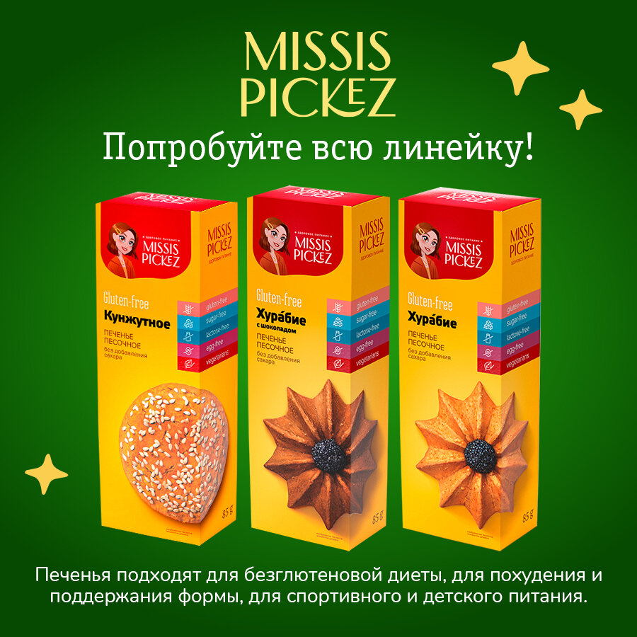 Печенье песочное "Missis Pickez" Кунжутное, хурабие, хурабие с шоколадом, криспи Без лактозы глютена и сахара Набор - 4 пачки
