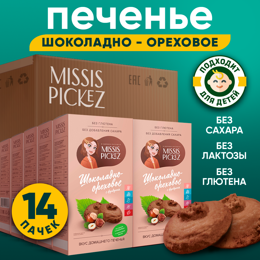 Купить Missis Pickez Печенье Шоколадно-ореховое без добавления сахара и глютена, без лактозы Натуральное для детского питания Набор - 14 пачек