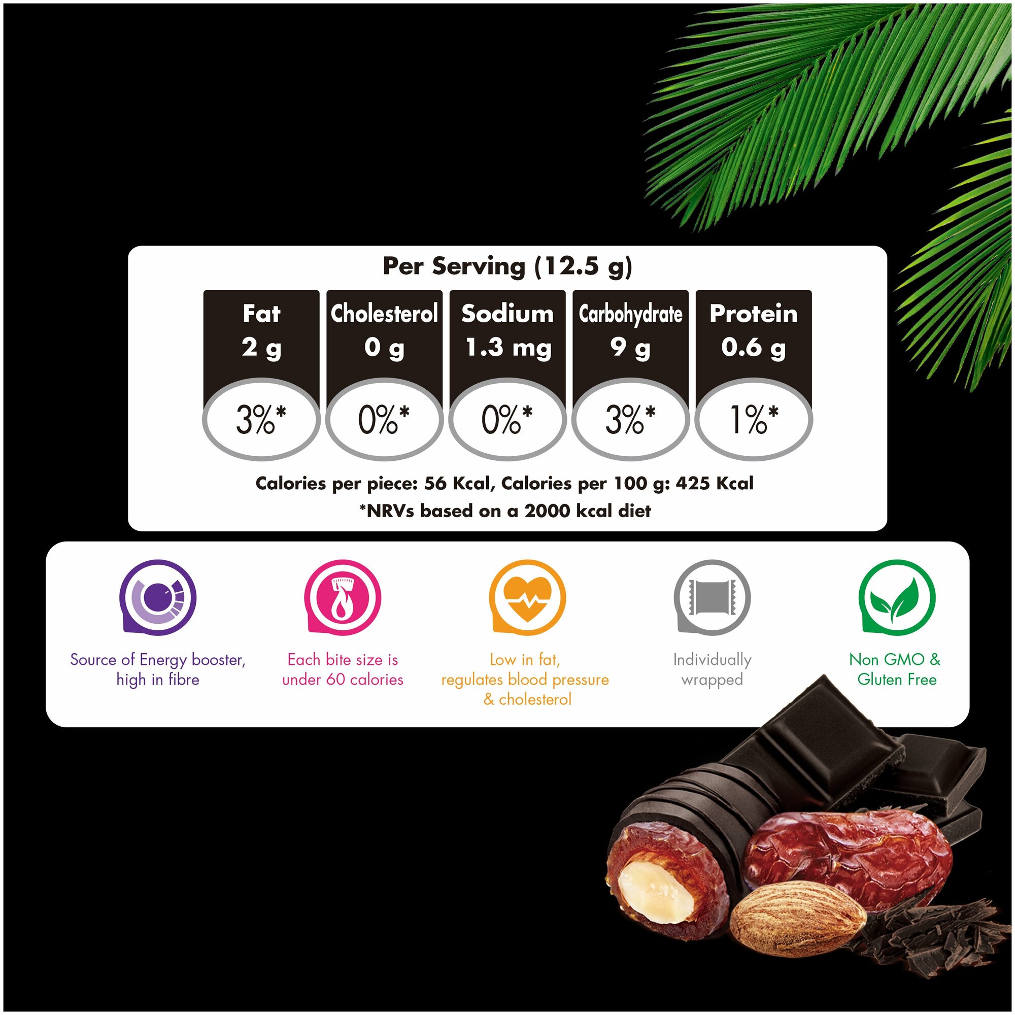 | Состав | финики сушеные, темный шоколад (подсластитель: мальтит, ксилит, экстракт листьев стевии (стевиозид); какао тертое, какао масло, какао порошок, молочный жир, эмульгатор: лецитин (соевый), цельное сухое молоко, эмульгатор: Е476, натуральный ароматизатор - ваниль), миндаль, соль. Массовая доля общего сухого остатка какао в темном шоколаде не менее 60%. Может содержать следы арахиса. |