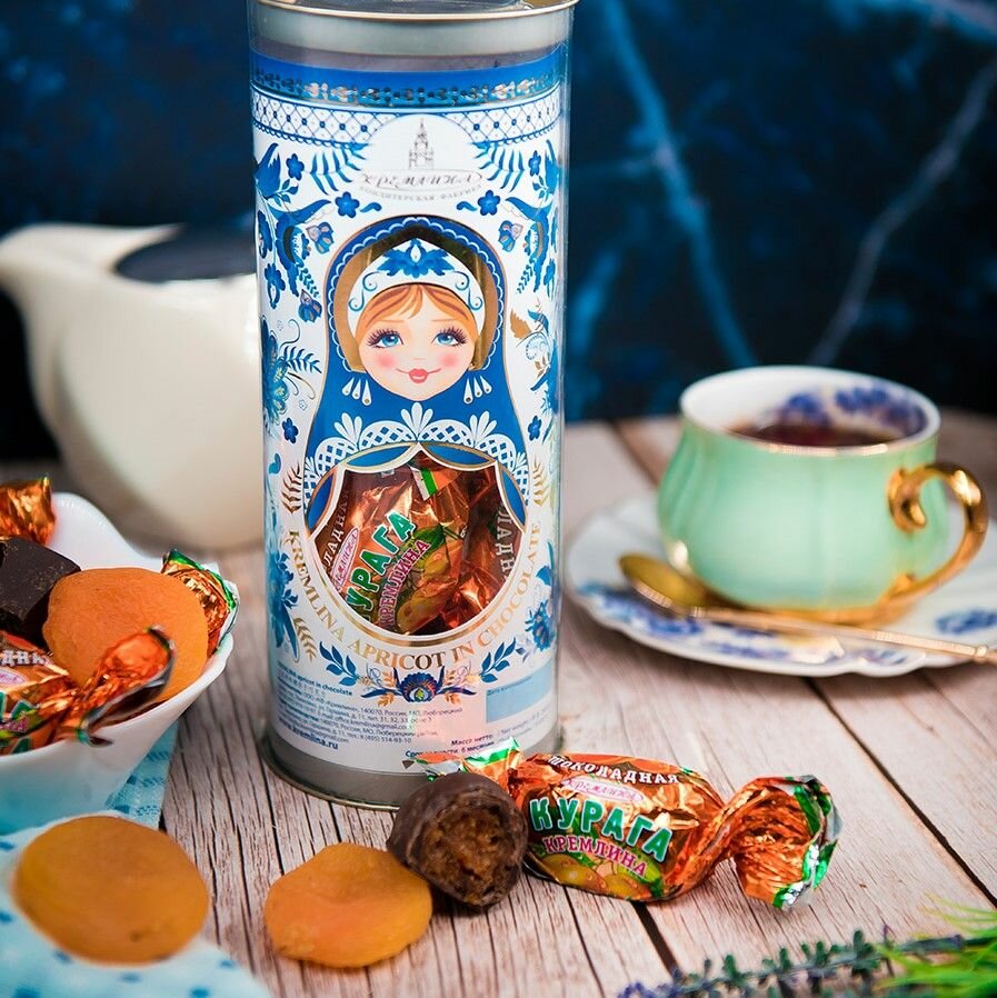 СохранитьПодарок на Новый Год, набор конфет подарочных Курага Шоколадная в тубах "Матрешка Гжель" , спайка 2 тубы по 250 грамм интересное:
