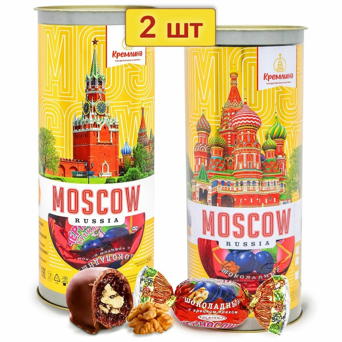 Купить Подарок новогодний, набор конфет подарочных Чернослив шоколадный с грецким орехом в тубах "Москва Золотая" , спайка 2 тубы по 250 грамм