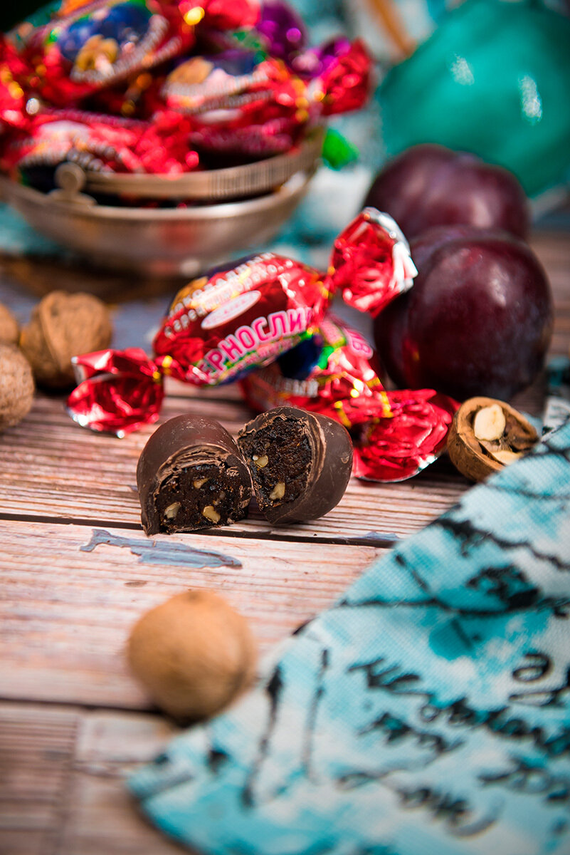 Шоколадные конфеты из сухофруктов Чернослив с грецким орехом и Курага с грецким орехом, короб - телевизор 2 кг