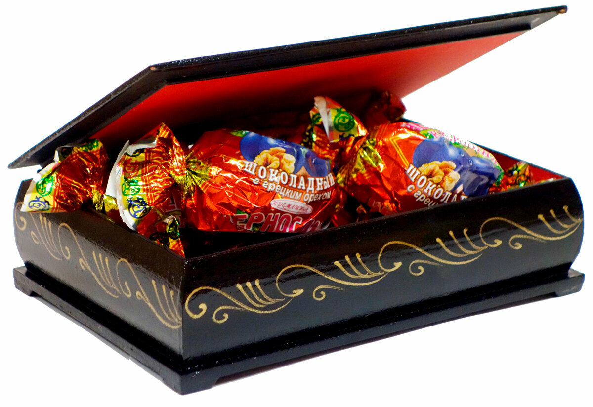 Подарок новогодний, набор конфет подарочных Чернослив Шоколадный с грецким орехом в лаковой шкатулке "Берендеево Царство. Лето", 150 грамм