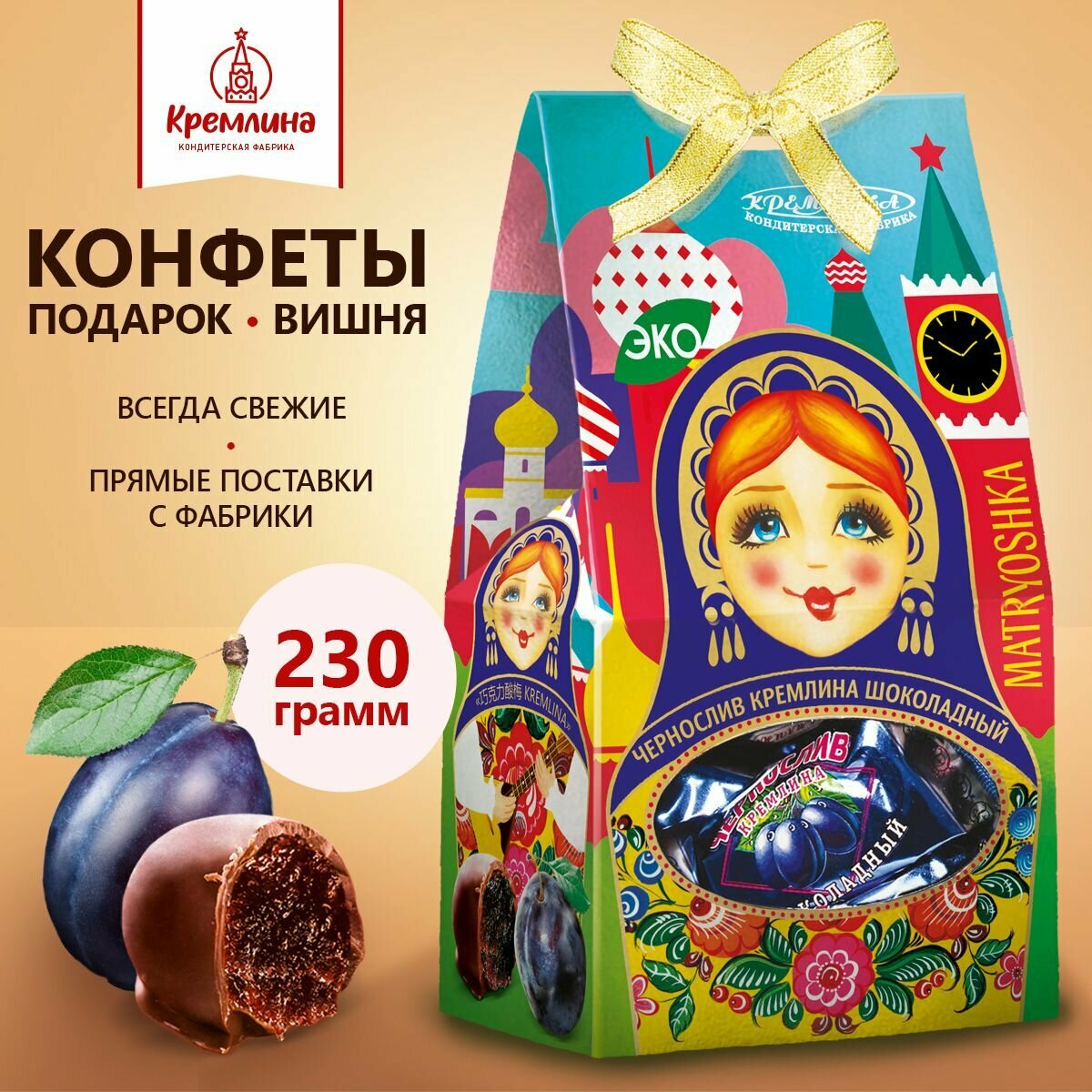 Конфеты Кремлина чернослив шок. с грец. орехом,Матрешка Хохлома, 250г