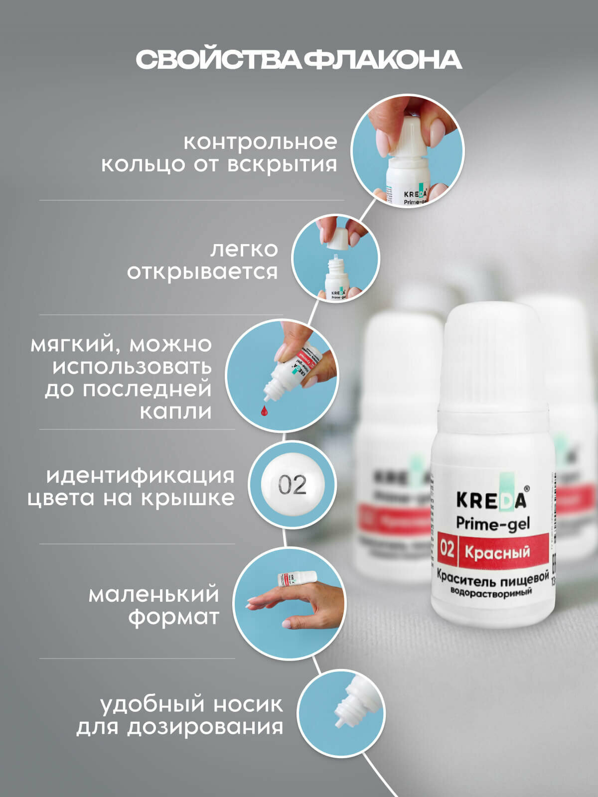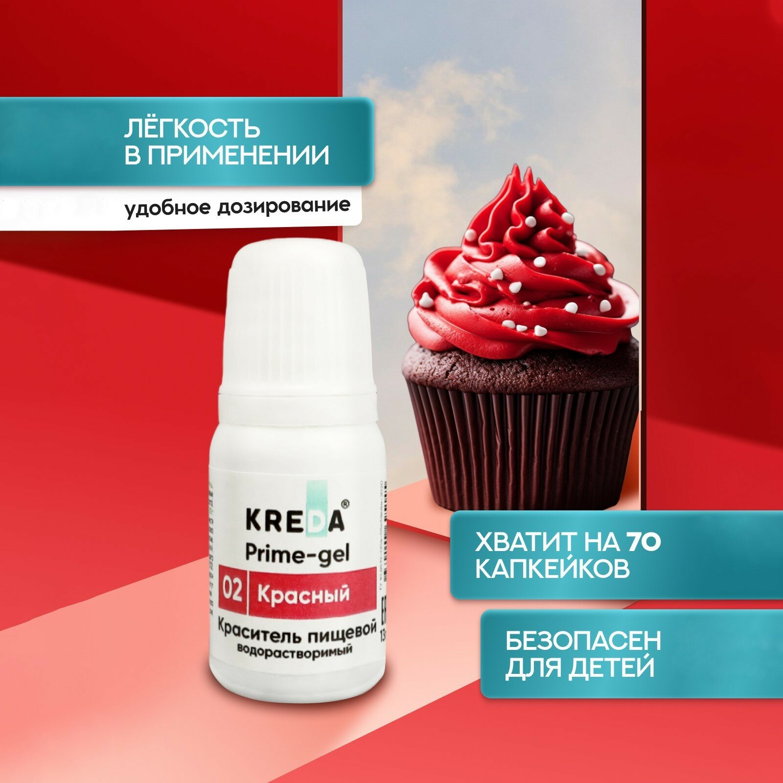 Пищевой краситель Kreda Prime-gel, красный, 10 мл, гелевый, водорастворимый