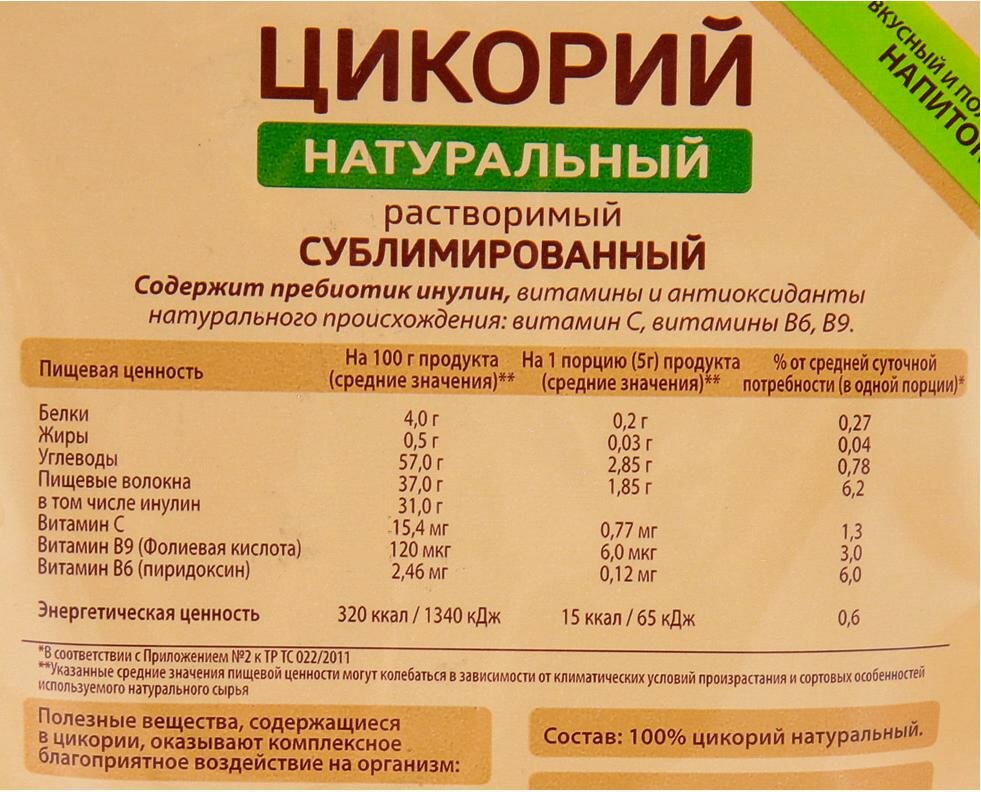 | Способ приготовления | положить в чашку 2-3 чайные ложки (5 г) цикория; залить горячей кипяченой водой и размешать; сахар и сливки добавить по вкусу |