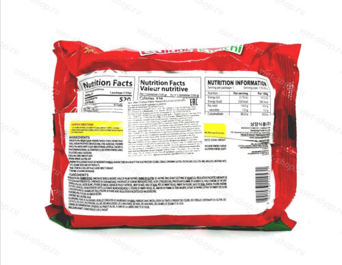| Состав | Лапша (76,7%): пшеничная мука (52%), пальмовое масло (11%), тапиока (12%), пшеничный глютен, соль, соевое масло, вода, загуститель Е412, регулятор кислотности Е501, Е500, Е339, Е330, эмульгатор. Е322, цвет Е101. Суповая основа (22,7%): вода, приправа (куриный ароматизатор 0,85%, дрожжевой экстракт), сахар, соевый соус (вода, соевые бобы, пшеница, соль), порошок красного сладкого перца, соевое масло, сахар, чеснок, экстракт чили, соль, порошок лука, крахмал тапиоки, экстракт дрожжей, черный перец, порошок карри. Хлопья (0,6%): семена кунжута, водоросли |