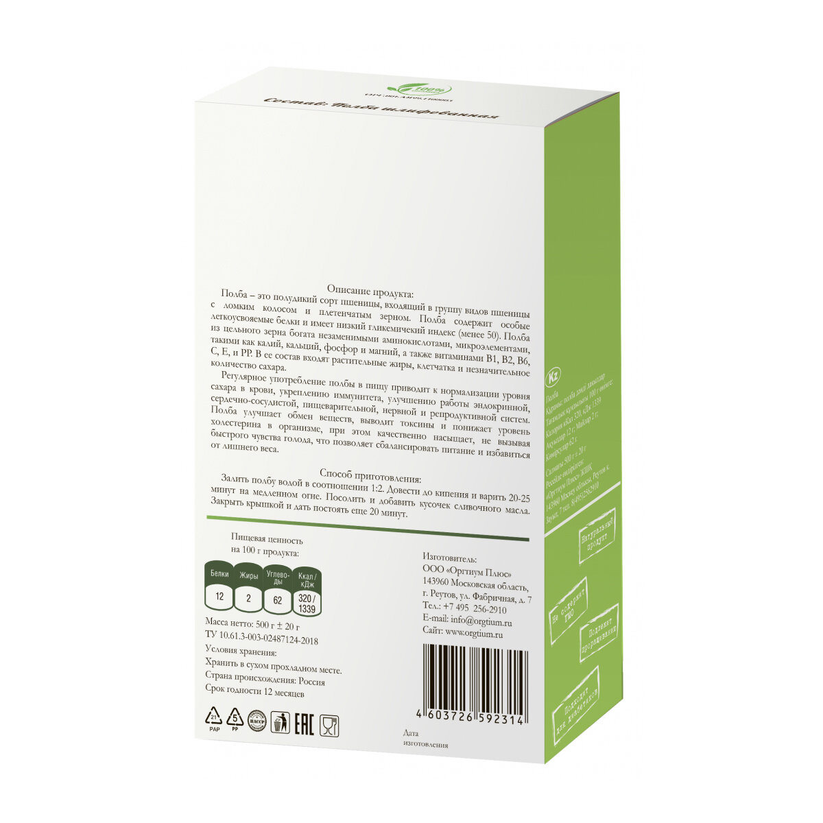 Полба цельнозерновая, крупа органическая, 500 гр. интересное: