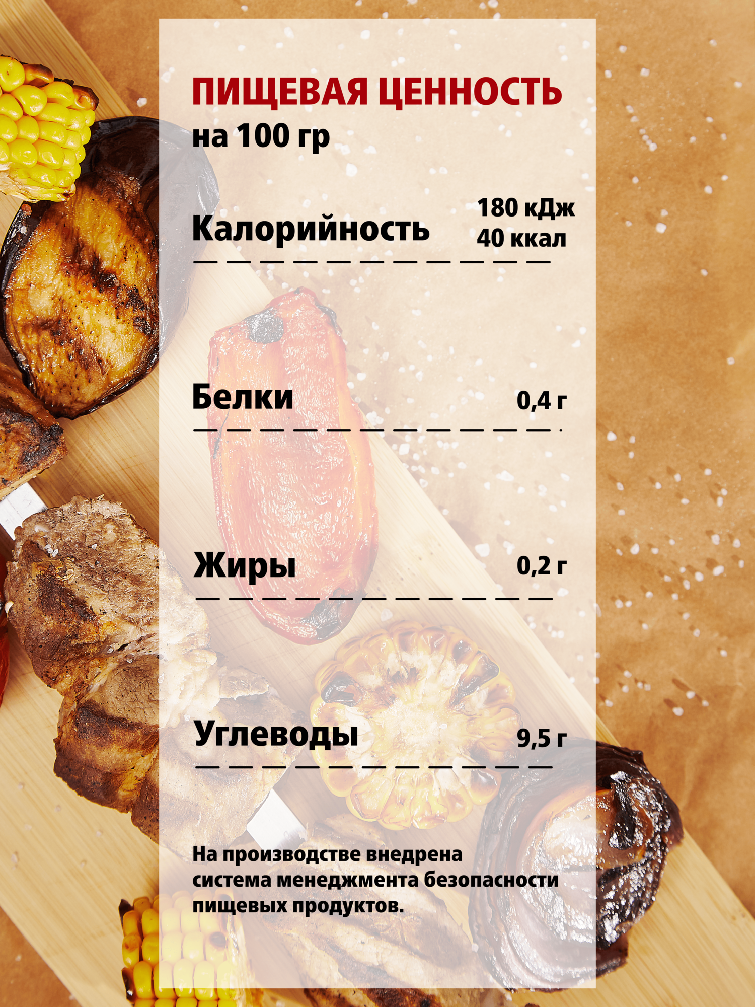 | Состав | вода, соль, патока, уксус винный, загустители - крахмал кукурузный, камедь ксантановая; соус соевый (вода, соевые бобы, пшеница, соль, сахар), лук, перец черный, сок гранатовый концентрированный, сахар, зерна горчицы, перец красный чили, тмин, сок яблочный концентрированный, экстракт дрожжей, регуляторы кислотности - кислота уксусная, кислота лимонная; красители натуральные - кармин, сахарный колер IV; ароматизаторы, консерванты - сорбат калия, бензоат натрия |