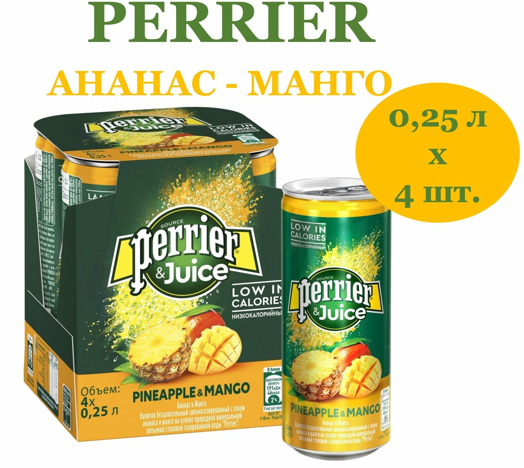 Напиток газированный Perrier (Перье) Ананас-Манго 0,25 л х 4 шт, ж/б интересное: