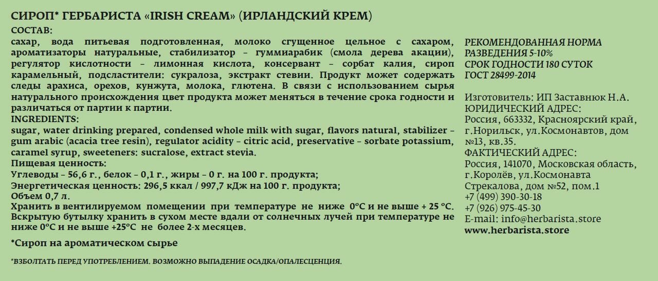 Купить Сироп для кофе, коктейлей, десертов и выпечки Herbarista, Ирландский Крем Irish Cream, 700 мл