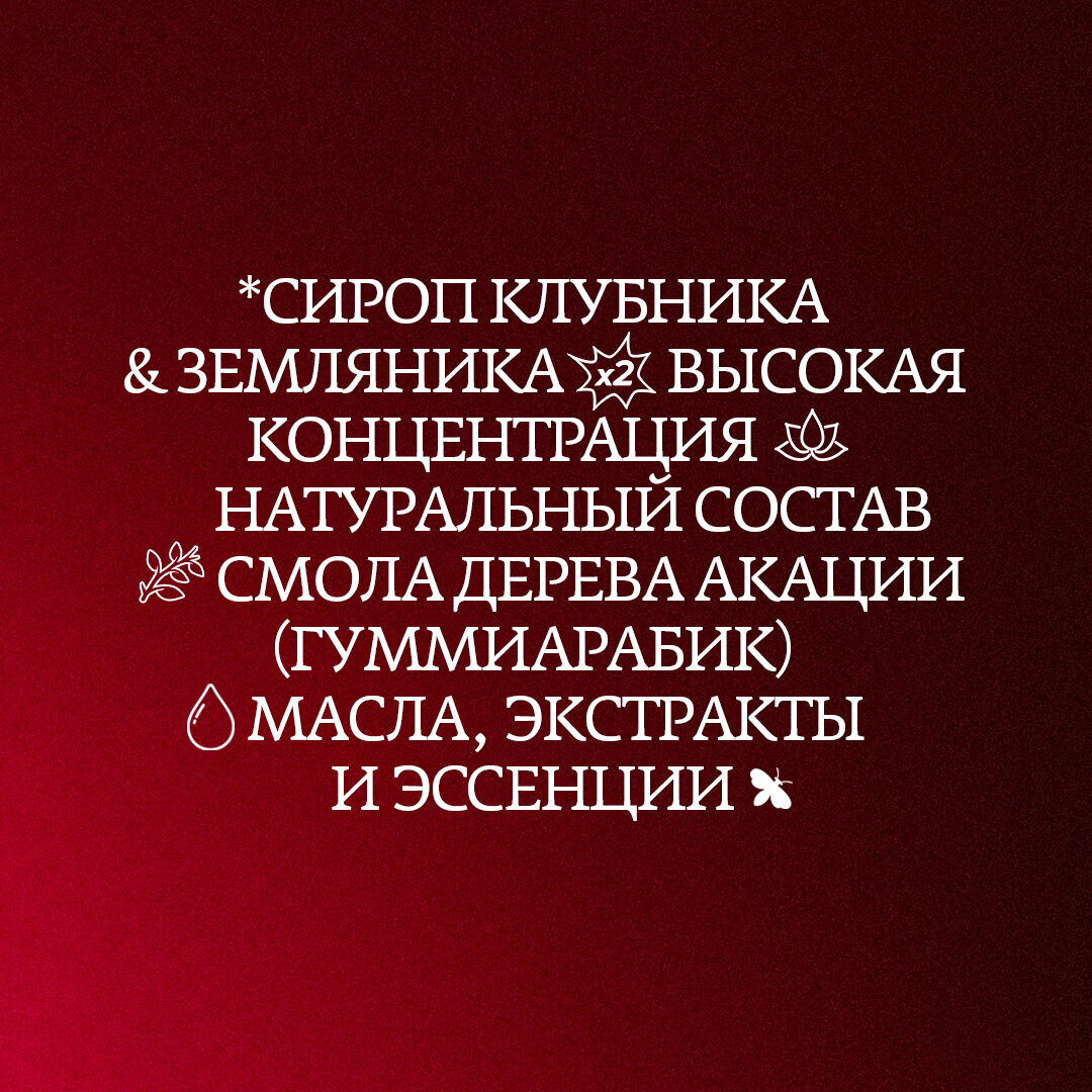 | Дополнительная информация | на основе натуральных ингредиентов; для приготовления сиропов используем соки и мякоть фруктов, пюре ягод, ореховые пасты, натуральные экстракты и специи |