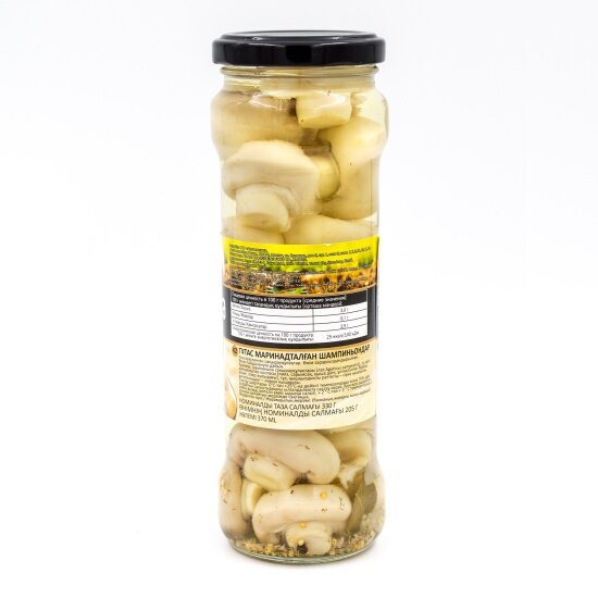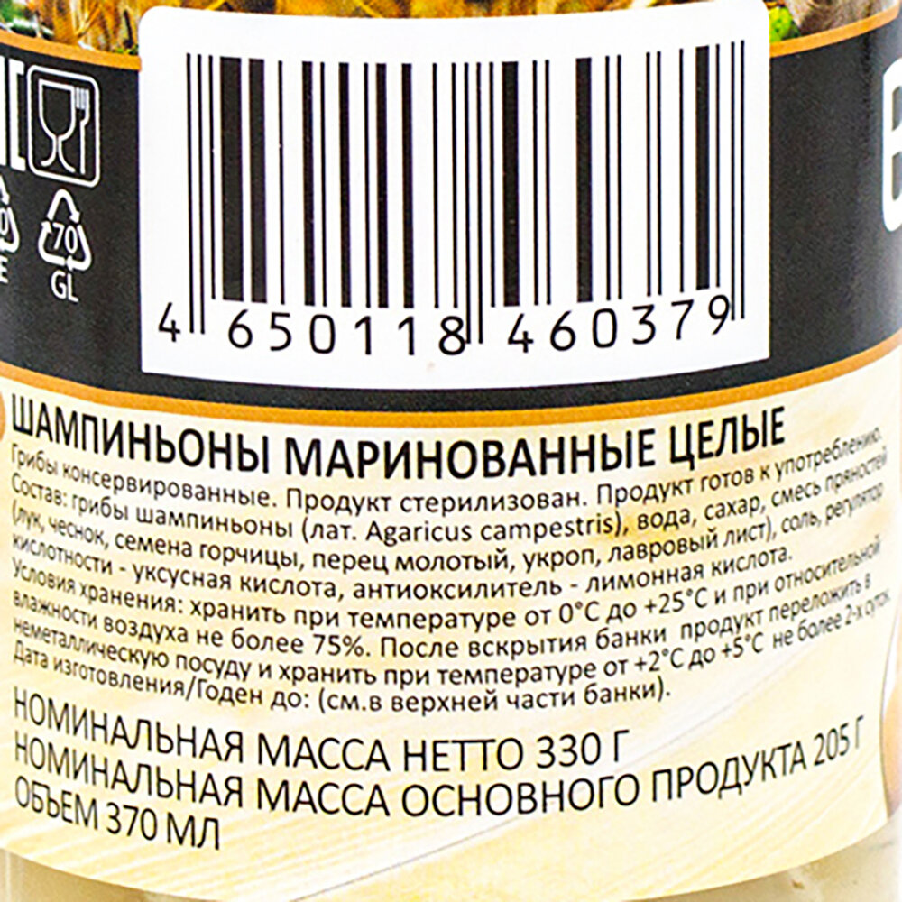 | Состав | шампиньоны, вода, лук, чеснок, черный перец горошком, семена горчицы, лавровый лист, укроп, петрушка, соль, сахар, регуляторы кислотности: лимонная кислота, уксусная кислота. |