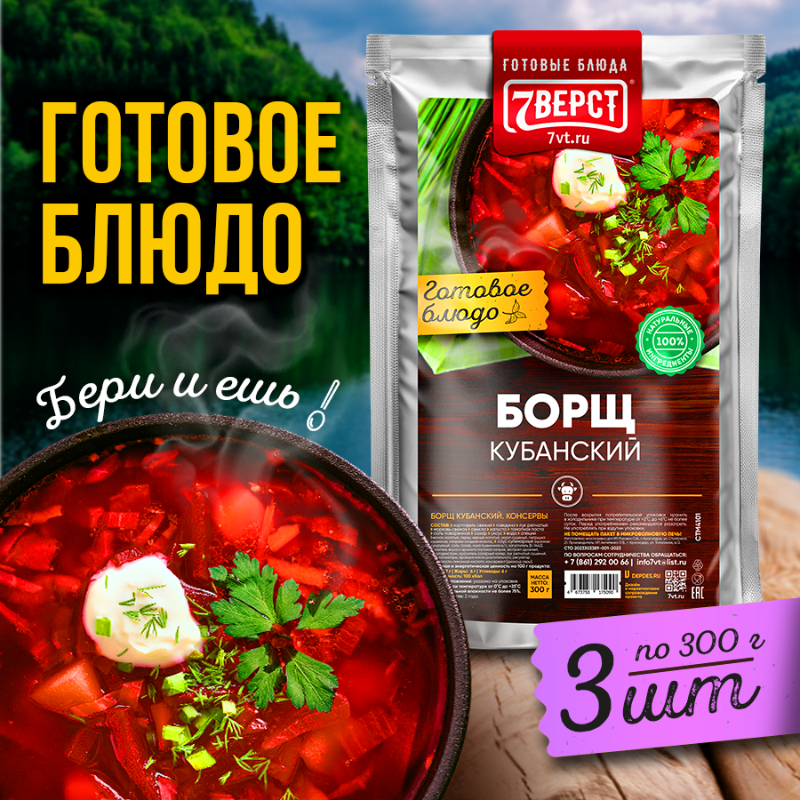 Ниже Вы можете прочитать отзывы на 7 вёрст Борщ с говядиной. Готовая еда в реторт-пакете. Консервы натуральные. Набор 3 уп. по 300 г, ознакомится с подробными характеристиками, посмотреть интересные обзоры и фотографии на 7 вёрст Борщ с говядиной. Готовая еда в реторт-пакете. Консервы натуральные. Набор 3 уп. по 300 г.